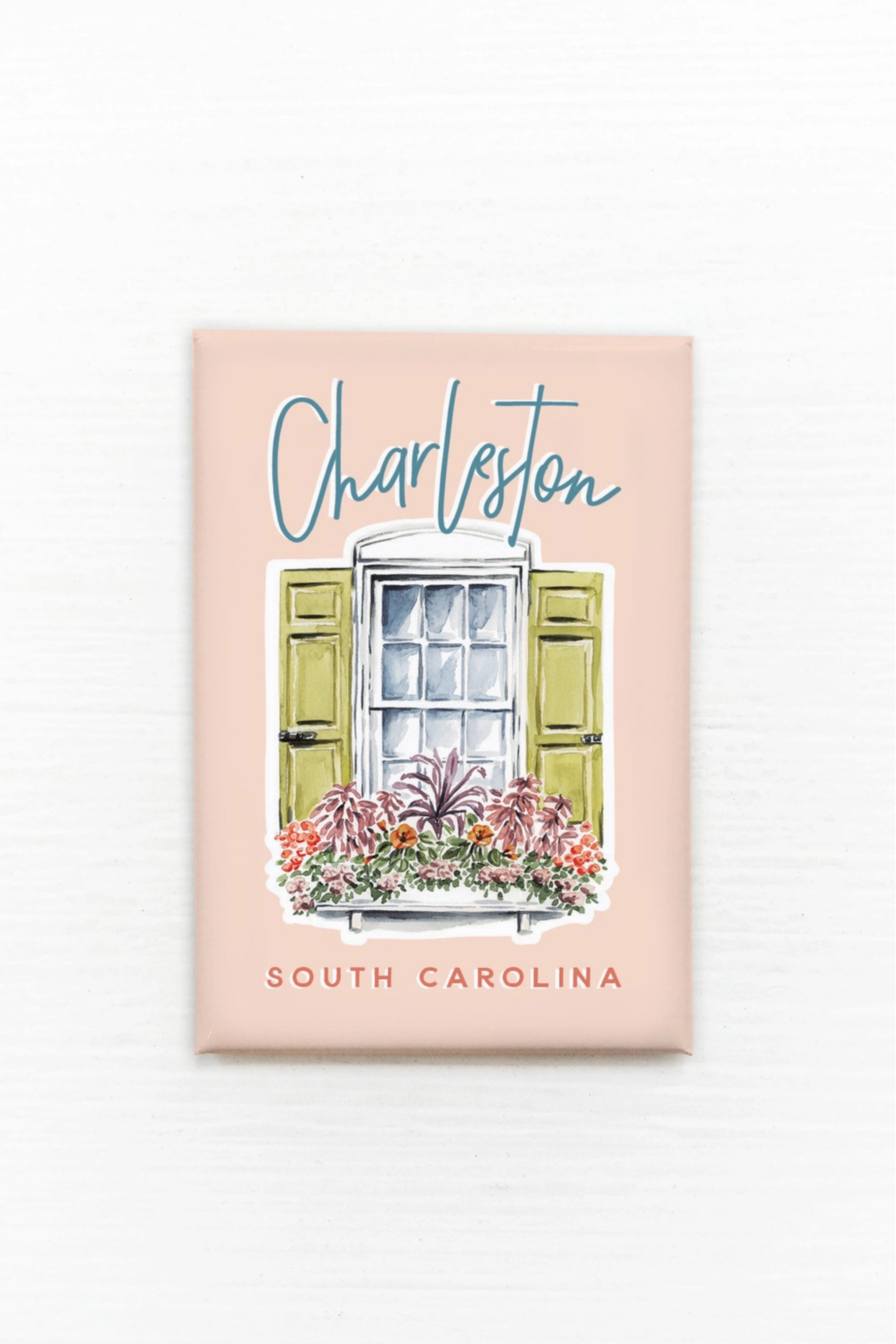 This charming pink magnet features a detailed illustration of a classic Charleston flower box, overflowing with vibrant blooms. A lovely keepsake that captures the charm and elegance of Charleston’s historic streets.