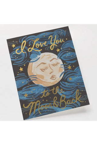 Tell someone you love them to the moon and back with this dreamy greeting card. Featuring swirling starry skies, a softly illustrated moon, and shimmering gold foil lettering, it’s the perfect card for anniversaries, Valentine’s Day, or just because. Comes with a cream envelope to match its heartfelt message.