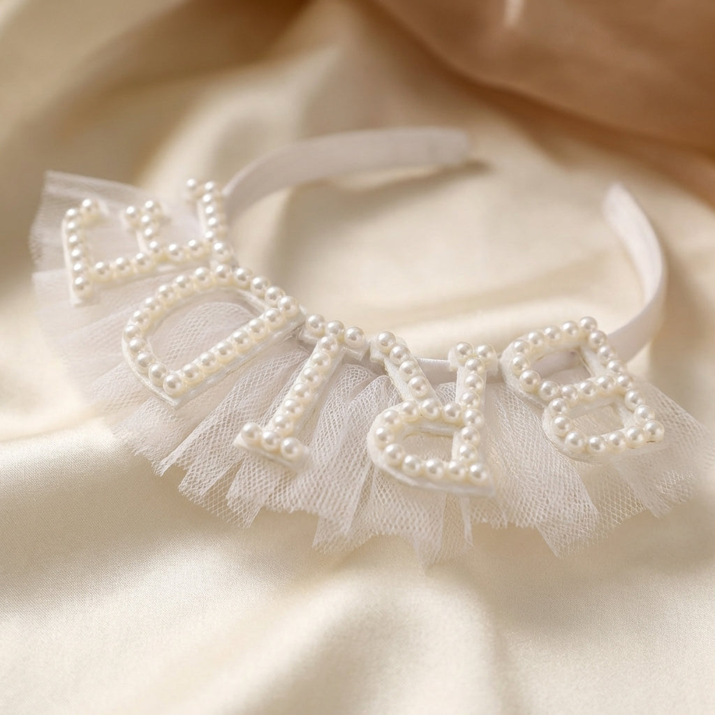 Make a statement on the big day with this elegant “BRIDE” headband. Pearl-embellished lettering sits atop soft white tulle for a timeless, feminine look that feels both fun and refined.