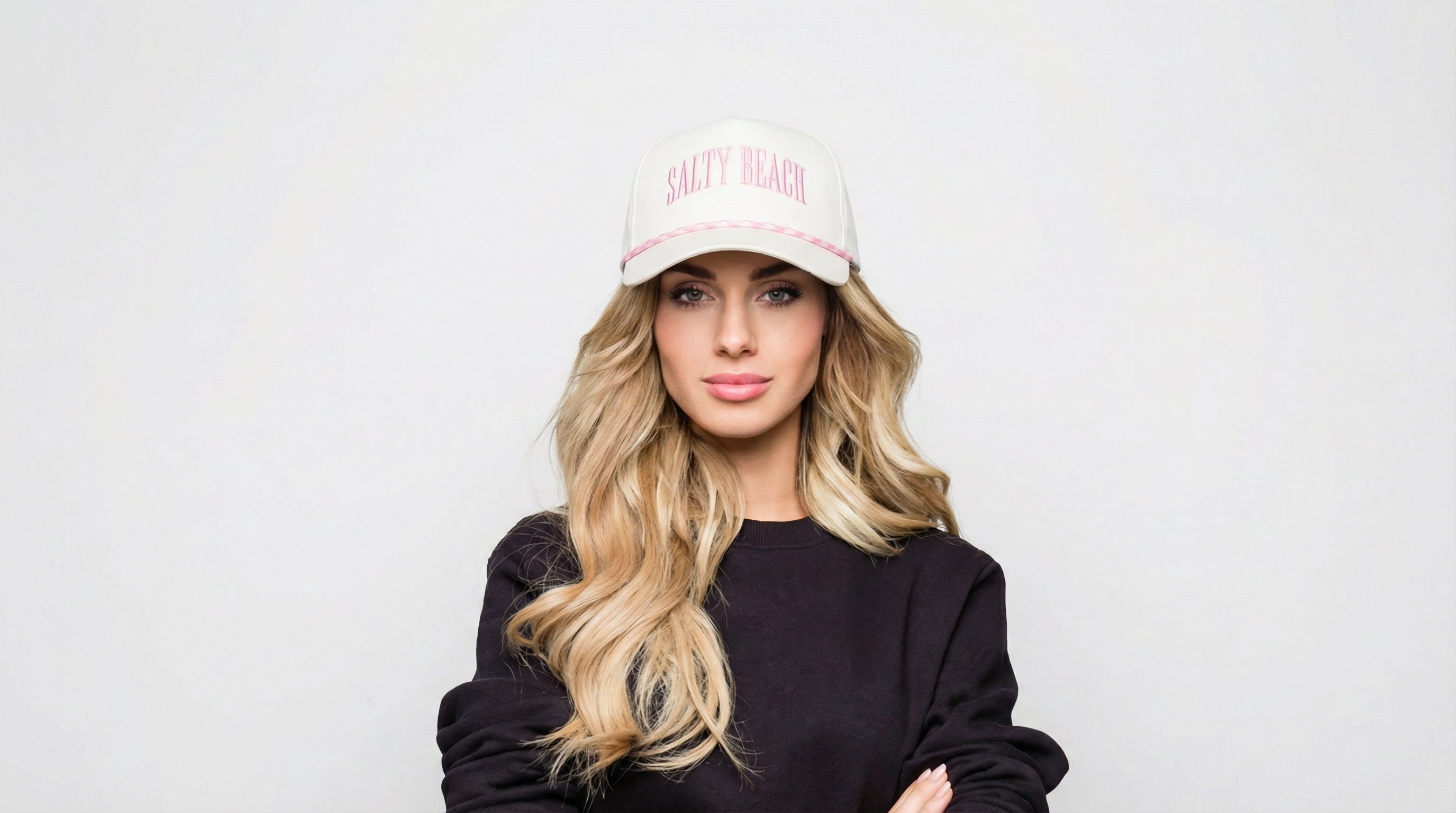 Catch the coastal vibe with the SALTY BEACH Lettering Embroidered Trucker Hat. This trendy cap features bold "SALTY BEACH" embroidery across the front, making it a perfect accessory for beach lovers and those who live for sunny days.
