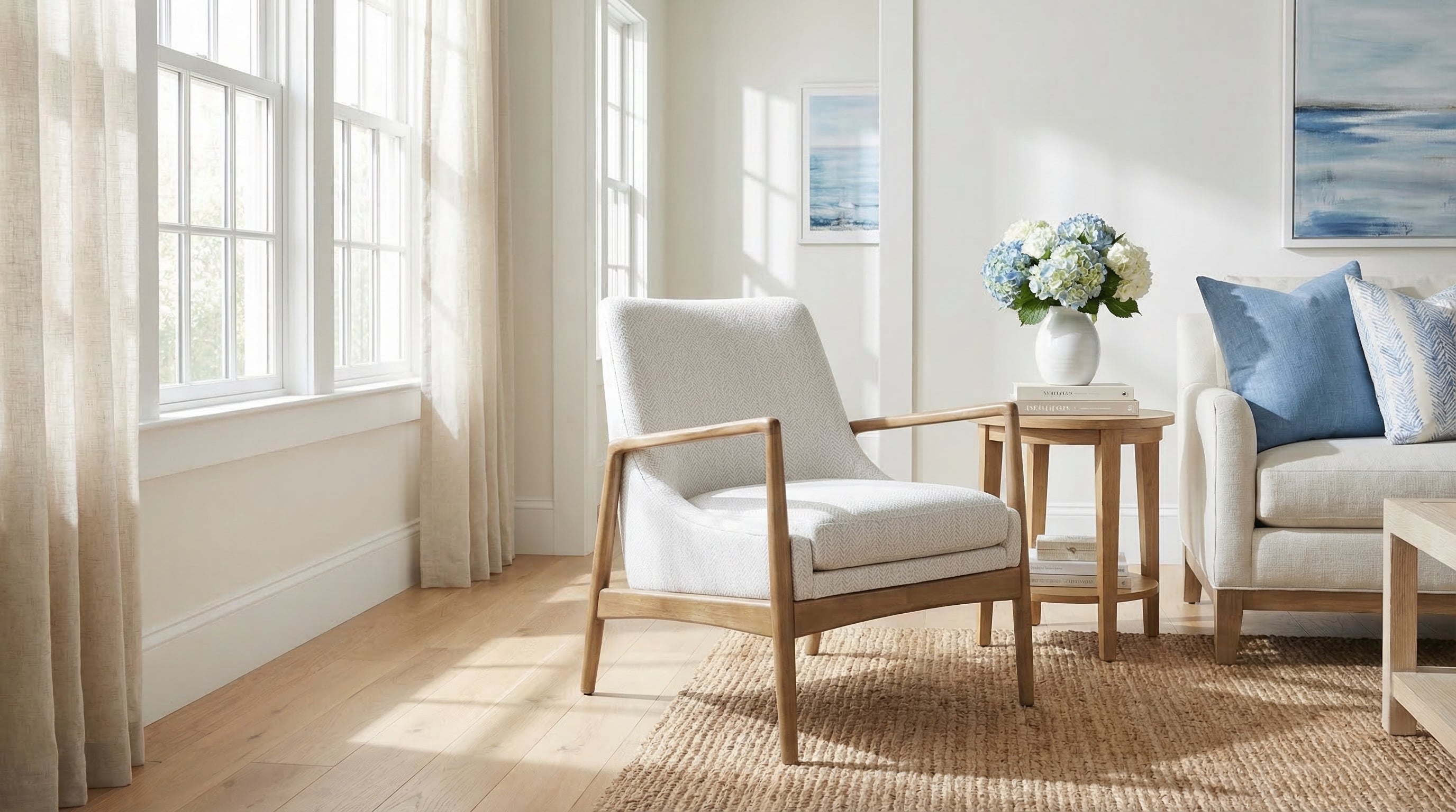 Pair the Bev Accent Chair with a woven jute rug, natural wood side table, and linen throw pillow to create a relaxed coastal-inspired seating area with layered natural textures.
