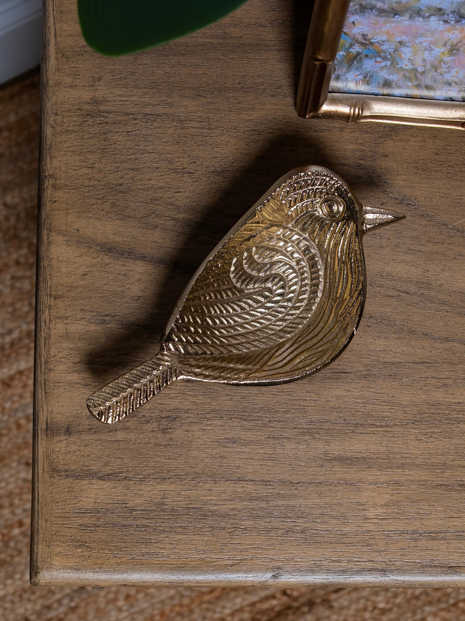Bring nature-inspired elegance to your table with this textured gold bird dish. Warm metallic tones create a sophisticated accent piece that works beautifully as a catchall for jewelry, keys, or small treasures.