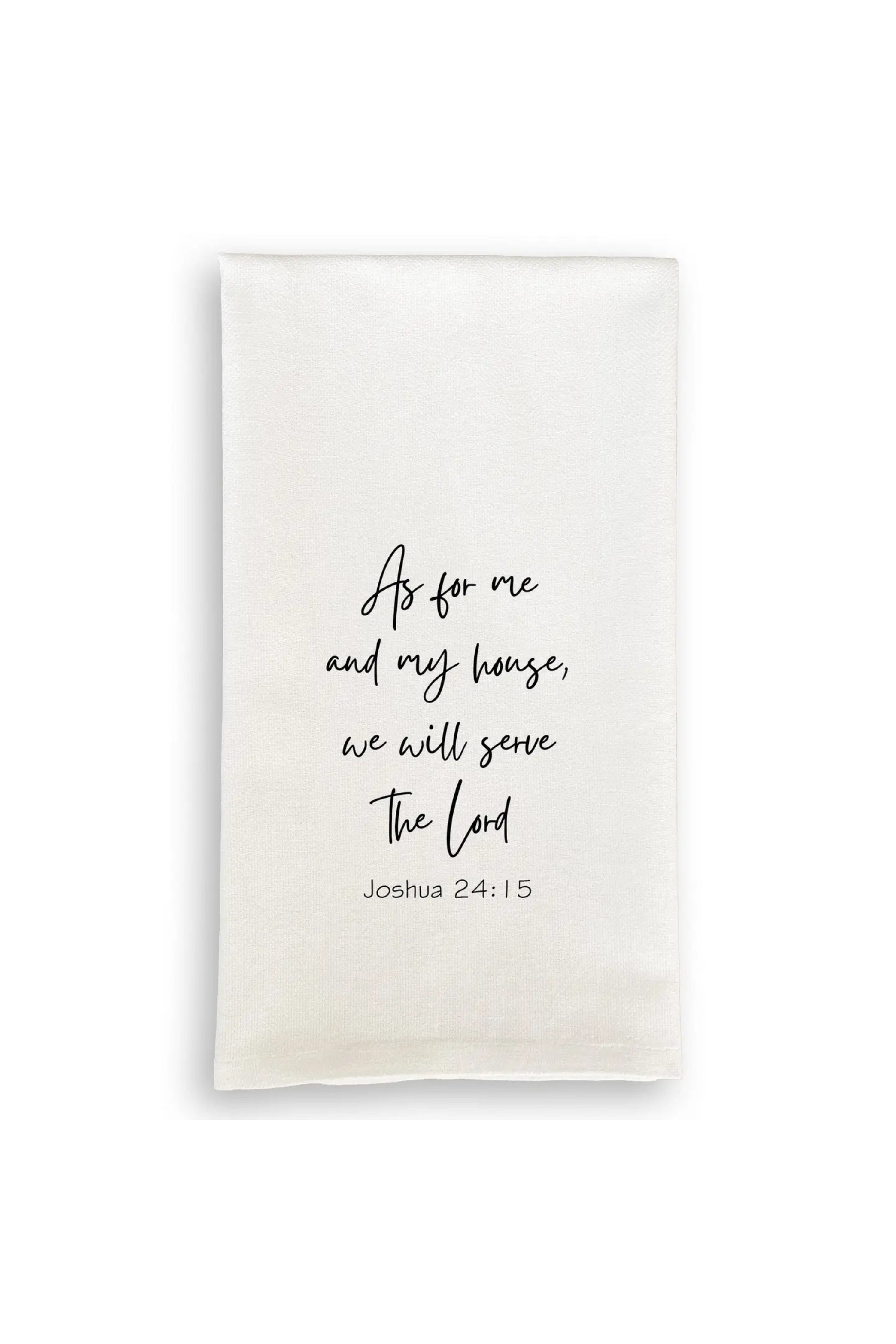 This minimalist kitchen towel features a timeless faith-inspired message printed in an elegant script: “As for me and my house, we will serve the Lord” with Joshua 24:15 beneath.