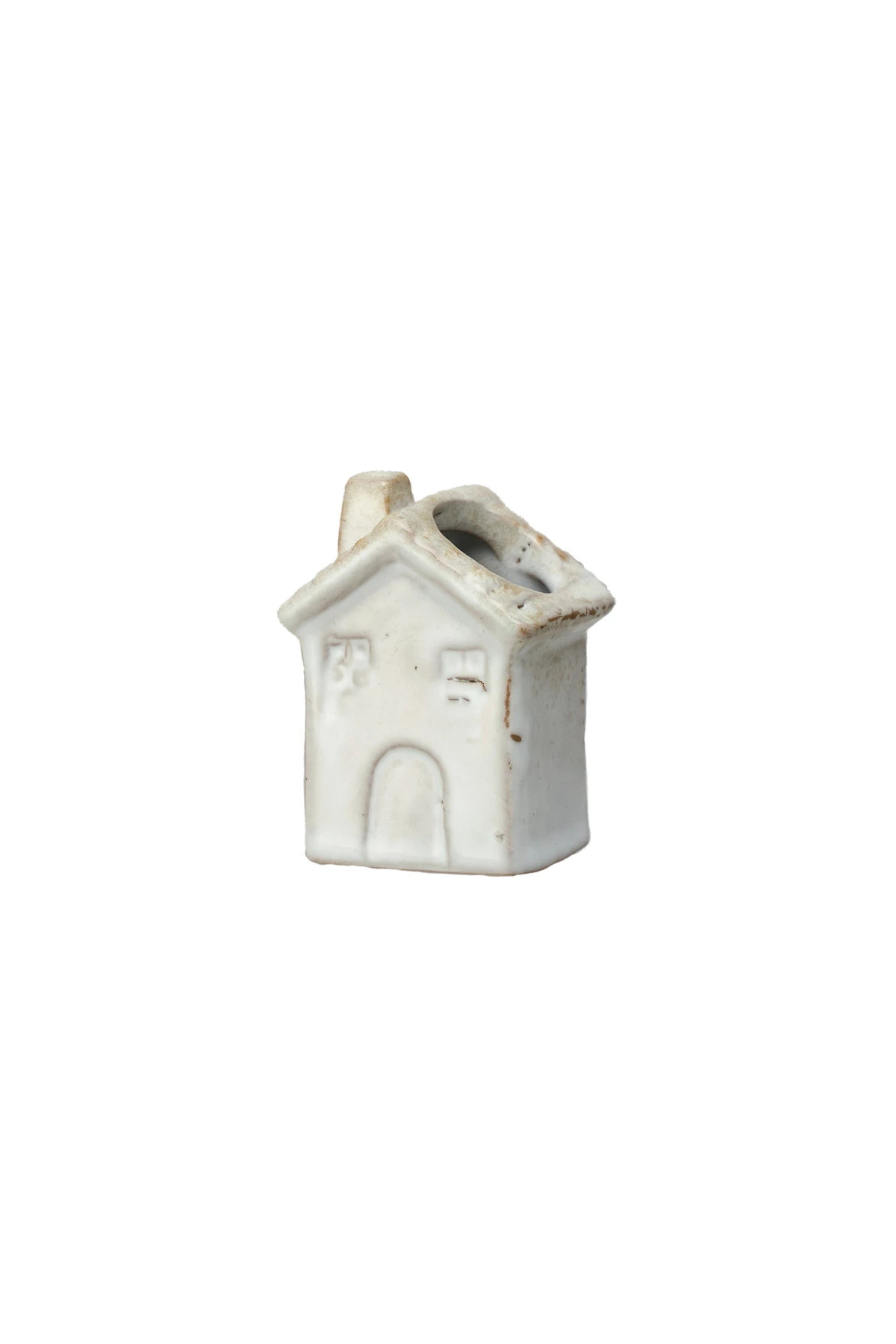 Charming stoneware toothpick holder shaped like a cottage, finished in soft antique white with a reactive glaze that gives each piece unique character. The reactive glaze creates subtle variations in tone and texture, ensuring no two holders are exactly alike.