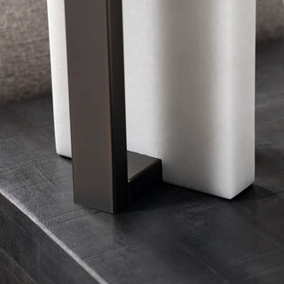 A polished slab of alabaster brings shape and a sculptural element to your space with the Wylie Table Lamp. A bronze metal frame adds balance and symmetry. It is topped with a white linen rectangular shade.