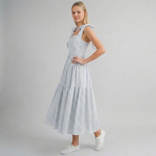 Tie V-Neck Long Sleeve Cinched Waist Midi Dress
