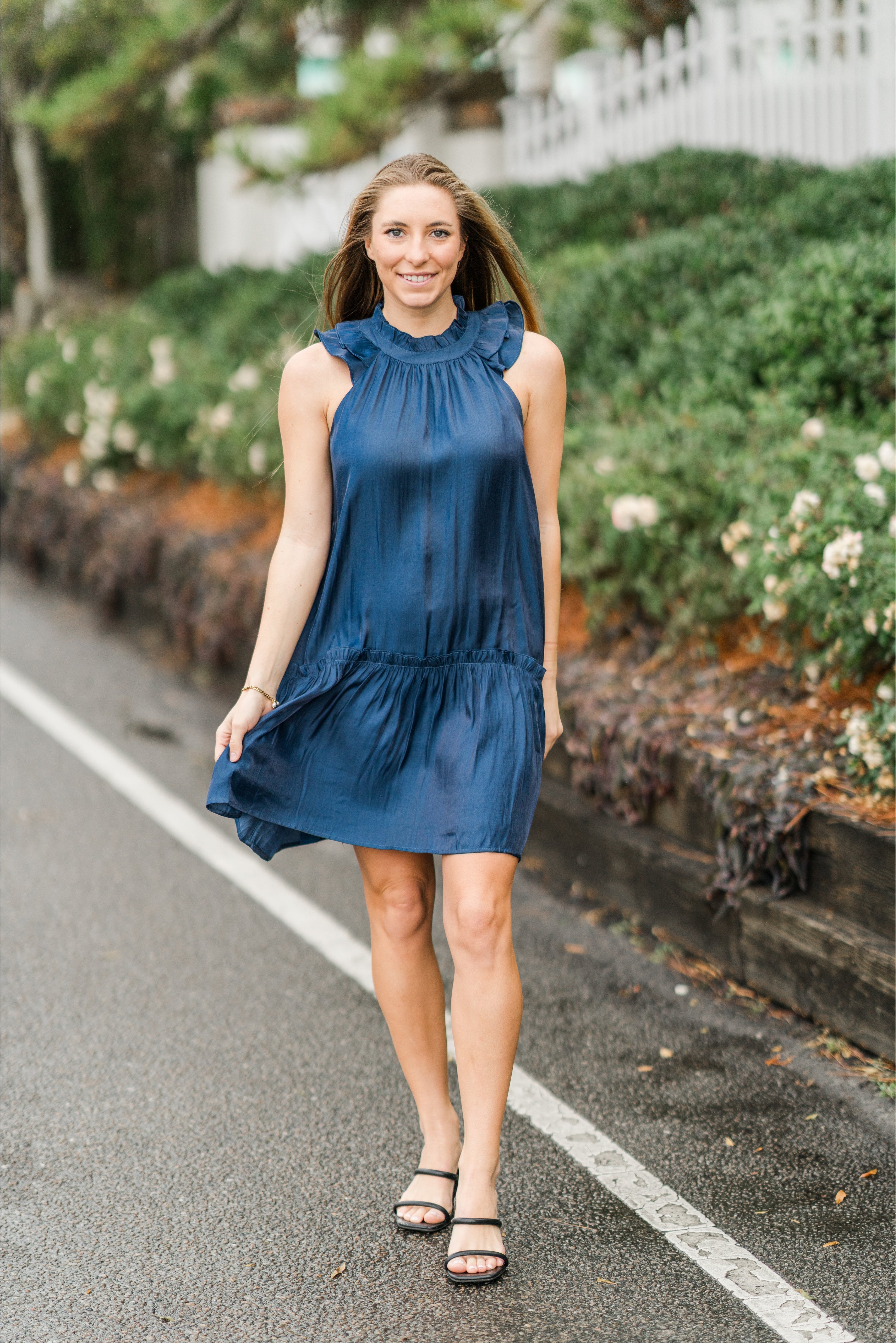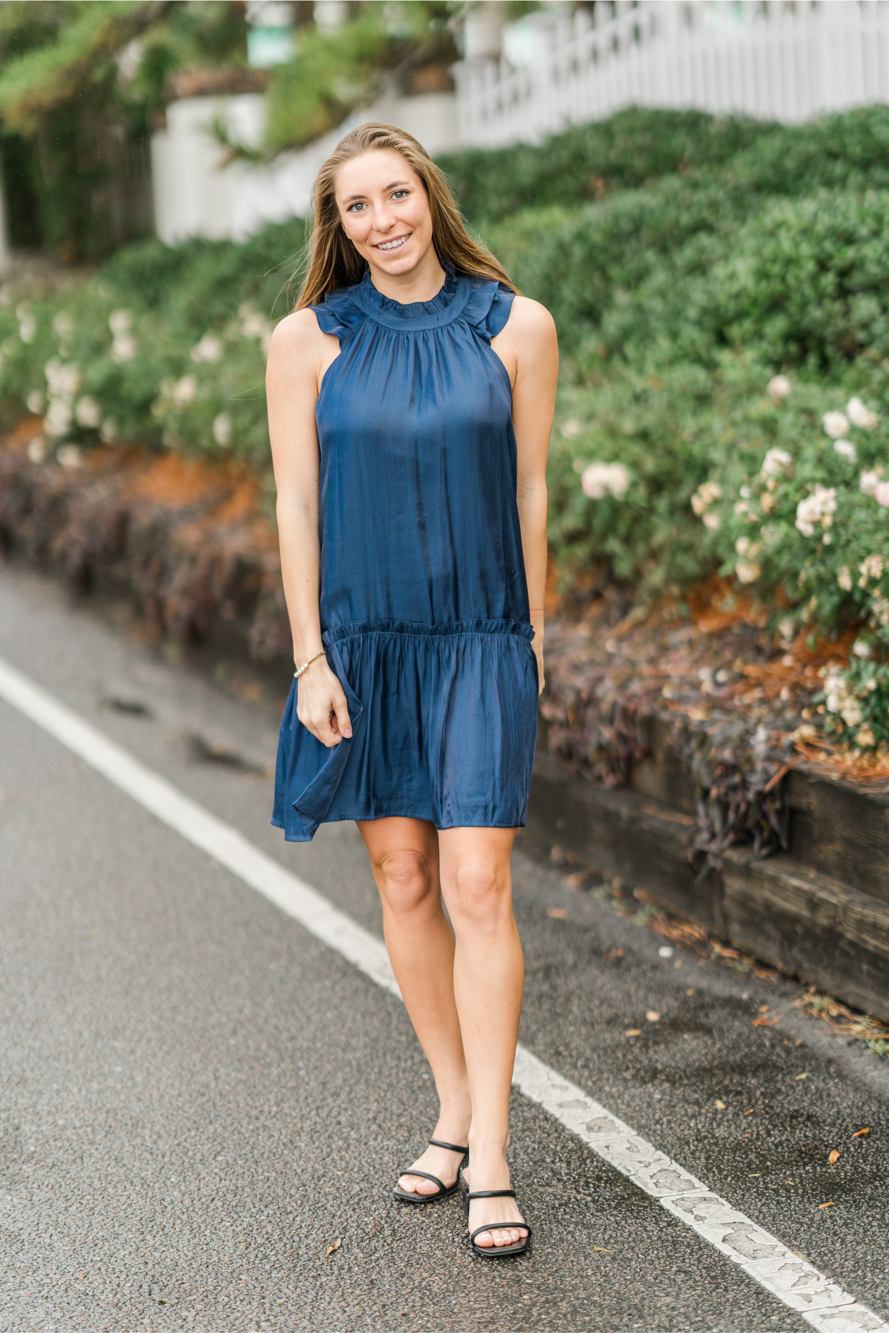Crafted in a rich navy hue with a soft, fluid drape, this sleeveless dress features a gently gathered ruffle neckline and a relaxed silhouette that moves beautifully with you. A subtle drop-waist seam adds shape while maintaining all-day comfort.