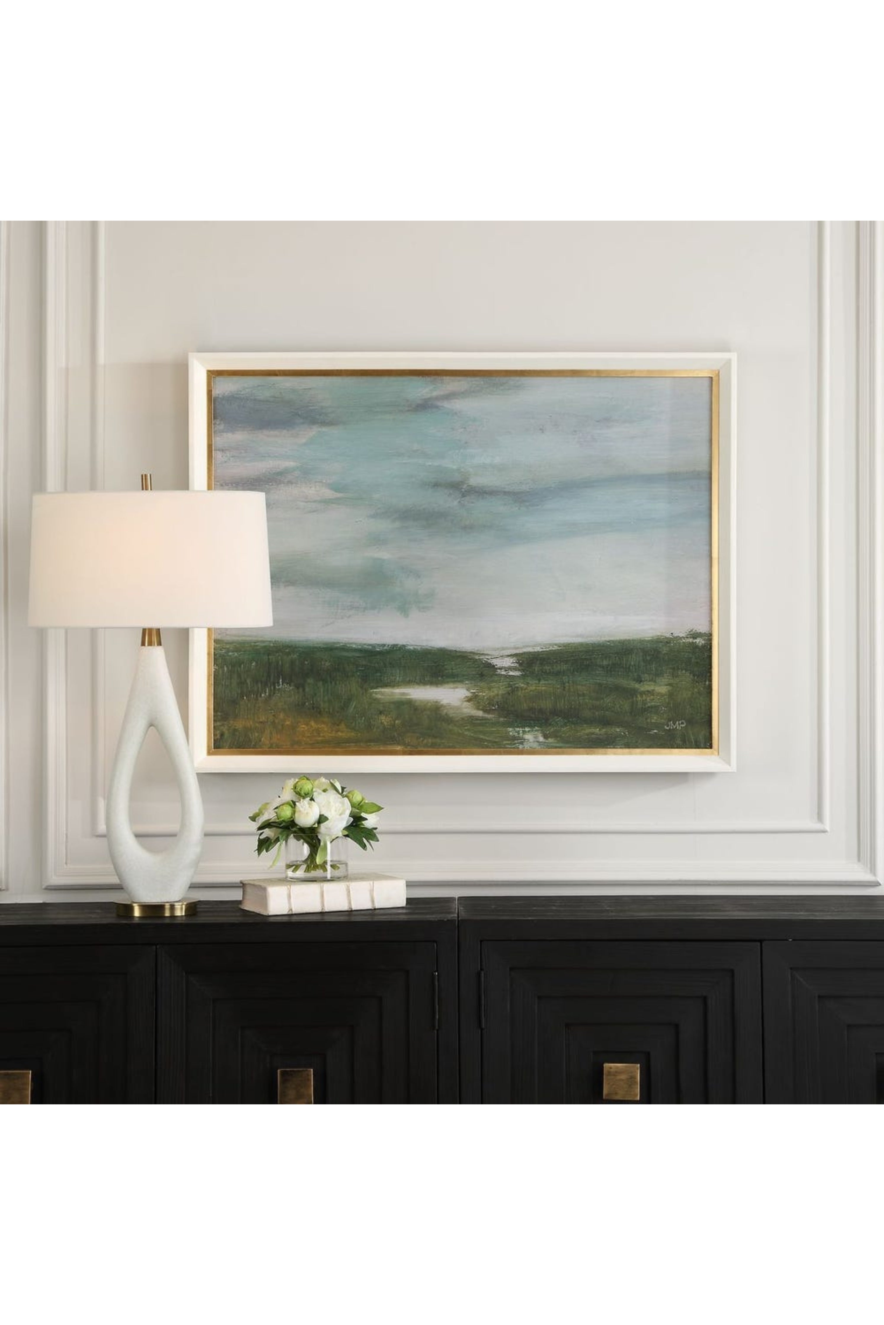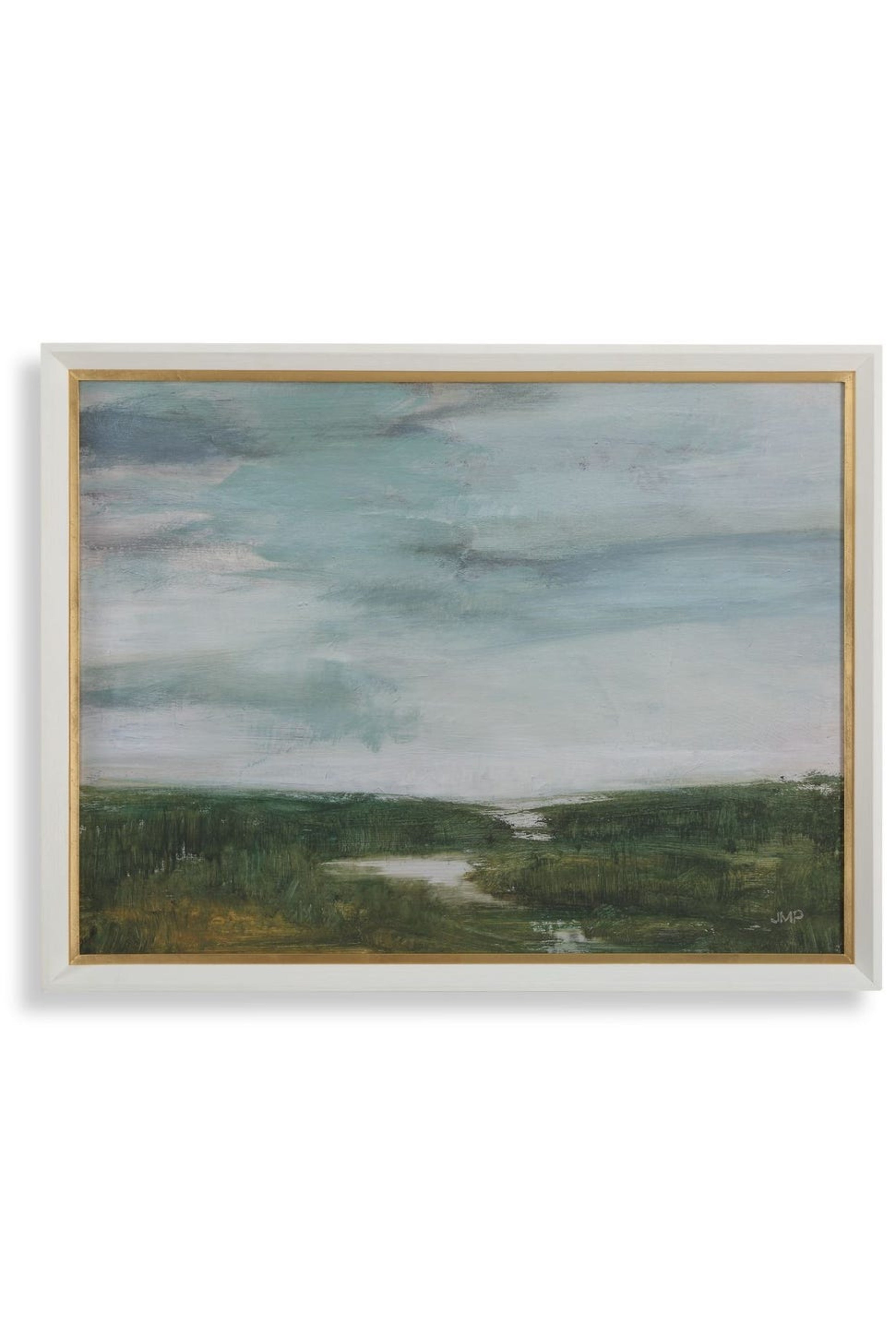 Discover the serene beauty of the low country with The Path Of The Water framed print. An idyllic blue sky meets the marsh showcasing the understated elegance of the South's iconic scenery. Surrounded by a white frame with wood grain detailing and gold leaf rabbet.