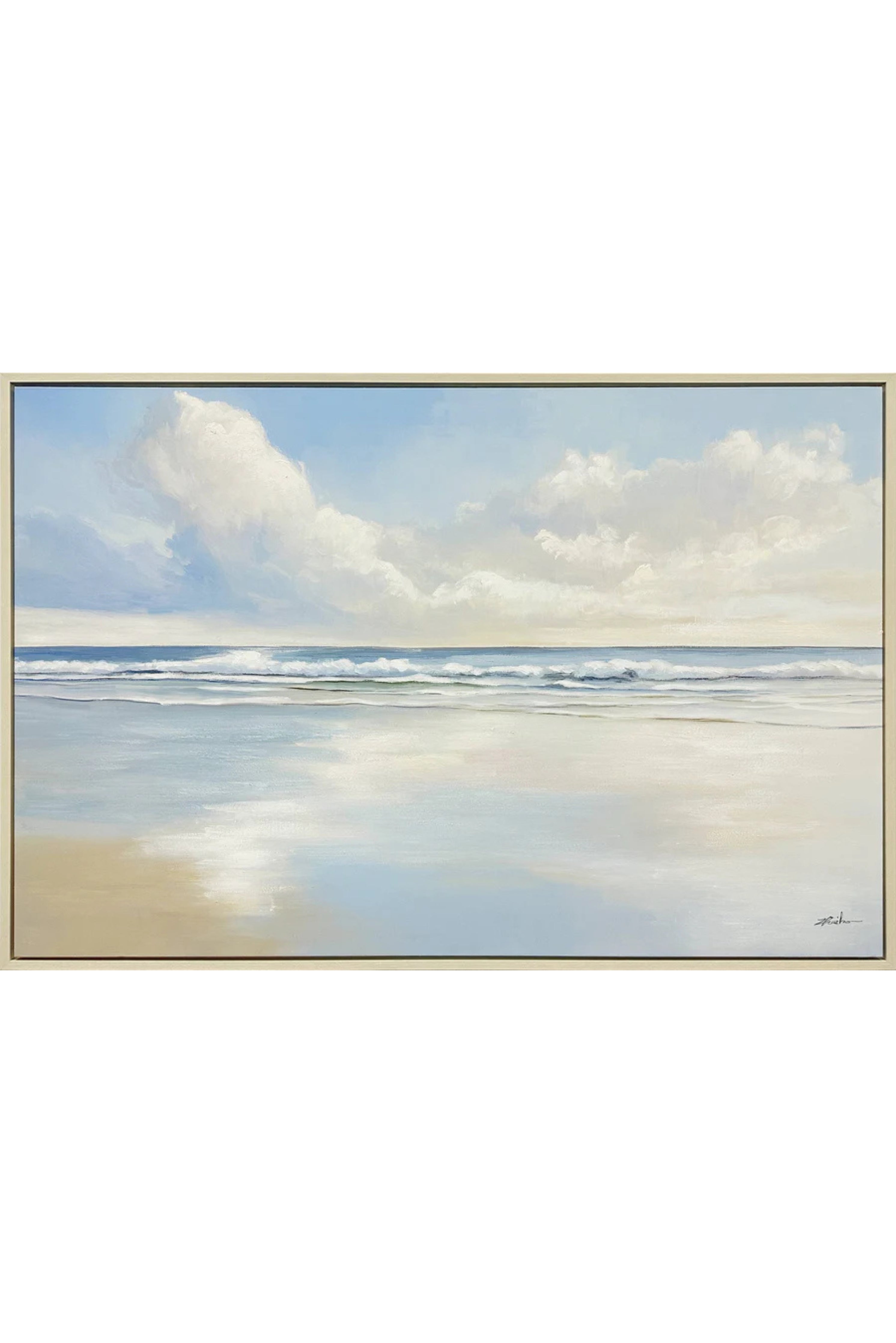 This painting portrays a tranquil shoreline where sea and sky dissolve into one another in soft, luminous tones. Gentle waves roll toward the shore beneath an expansive sky filled with billowing clouds, painted in airy whites and pale blues touched with warm light. The wet sand reflects the sky like a mirror, creating a sense of openness and calm that stretches across the horizon.