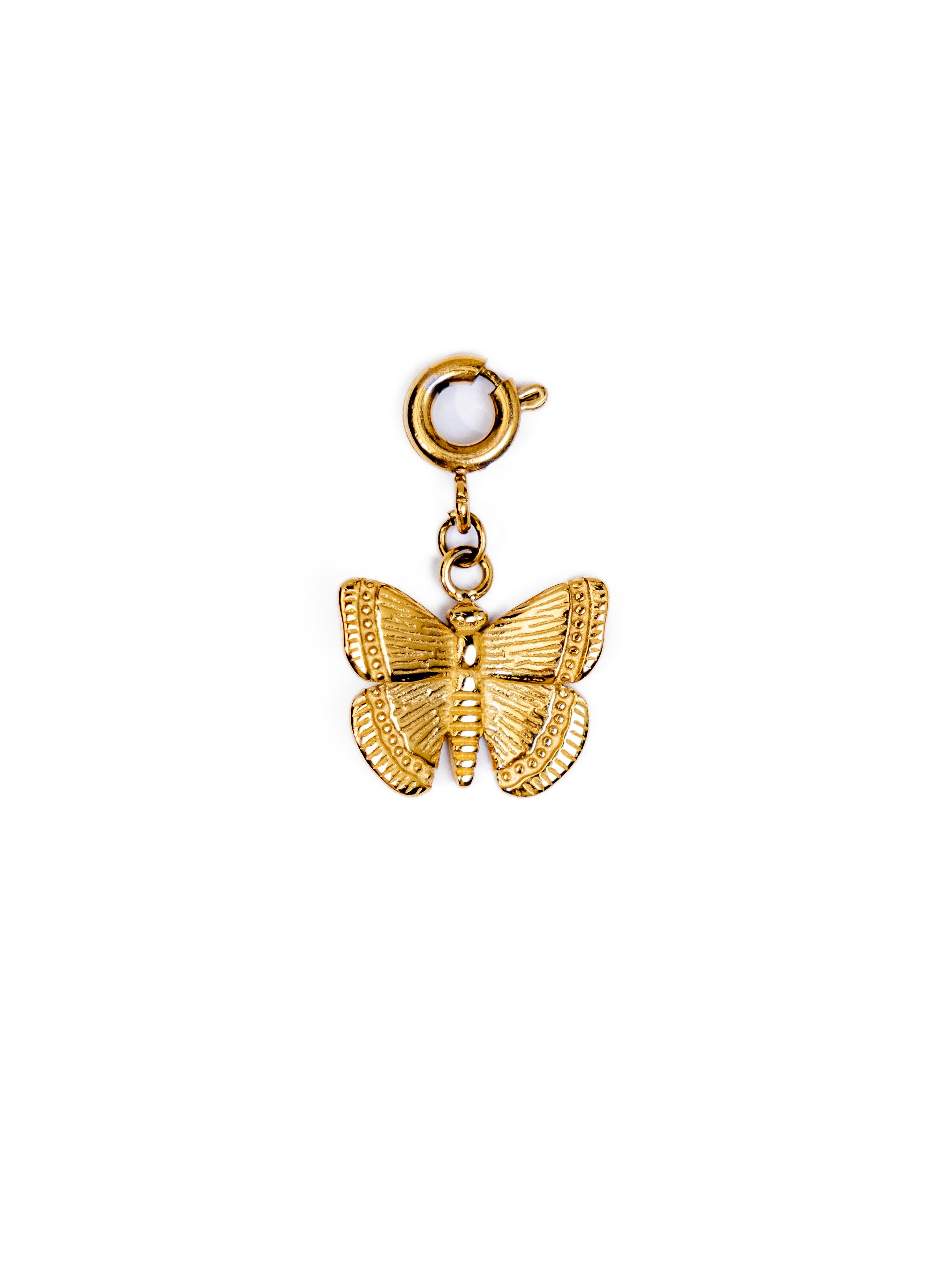 Graceful and symbolic, this gold-tone butterfly charm captures the beauty of transformation and freedom. With delicately textured wings and a polished finish, it’s a timeless piece that adds elegance and meaning to any jewelry design. Crafted to last, it’s both waterproof and hypoallergenic, making it safe for sensitive skin and perfect for everyday wear.