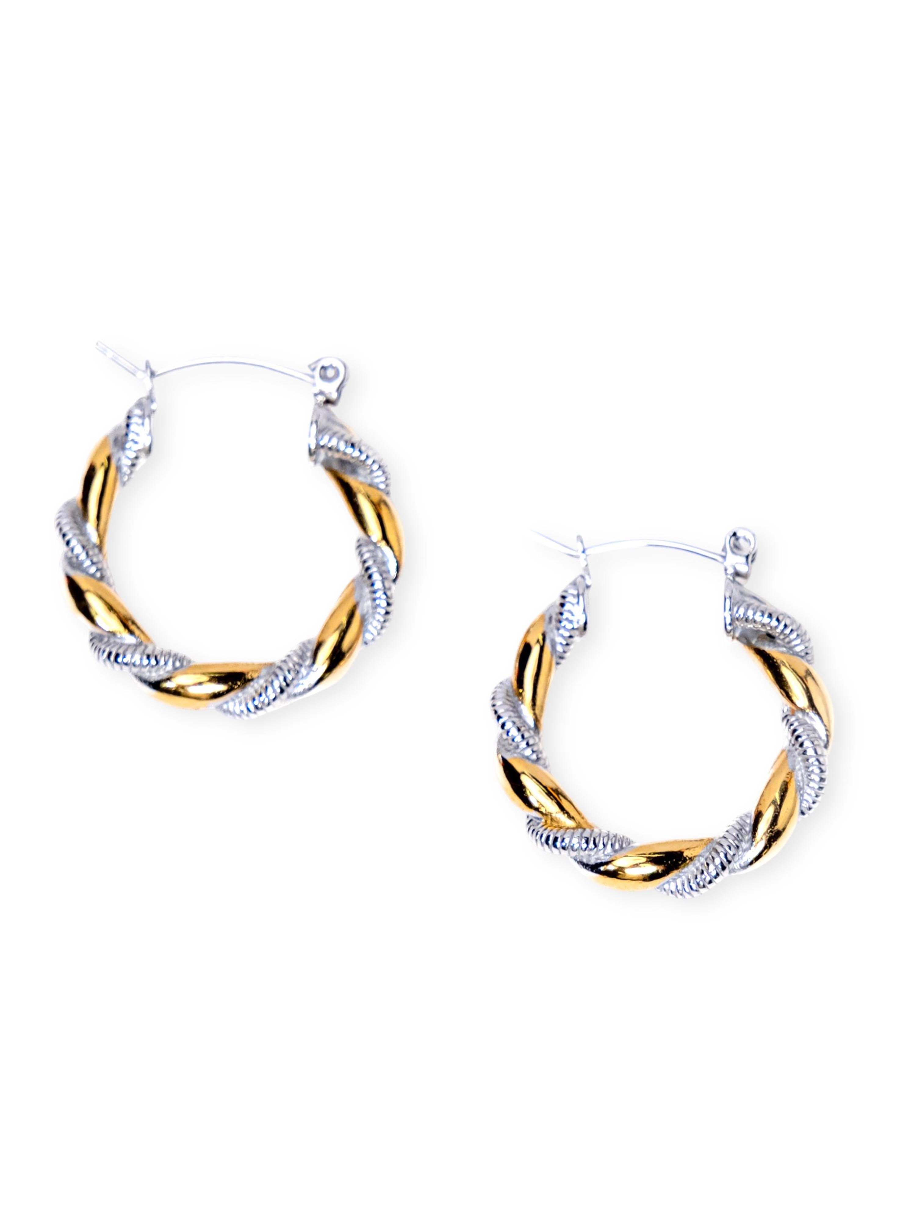 Bold and versatile, these twisted hoop earrings feature a stunning blend of gold and silver tones woven together for a modern, eye-catching look. Their textured, rope-inspired design adds dimension and shine, making them the perfect accessory to elevate any outfit.