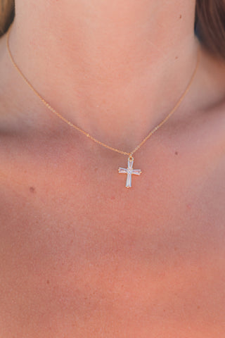 This elegant crystal cross necklace adds a radiant touch of grace to any outfit. Featuring a dainty gold chain and a baguette-cut crystal cross pendant, it shines with timeless beauty and faith-filled meaning. Perfect for layering or wearing solo, this necklace makes a meaningful gift or a special addition to your everyday collection.