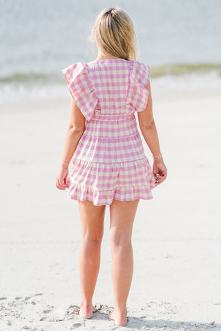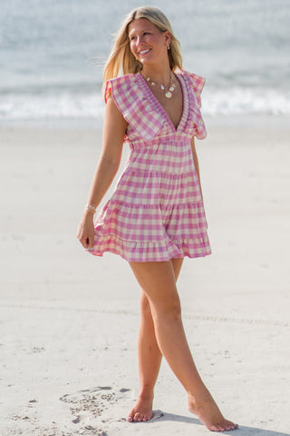 Sweet and playful, this gingham ruffle dress is a summertime standout. It features a smocked deep V-neckline, flutter sleeves, and a tiered skirt with ruffle trim that adds movement and charm. Available in pastel pink or blue, it's perfect for picnics, parties, or sunny strolls.