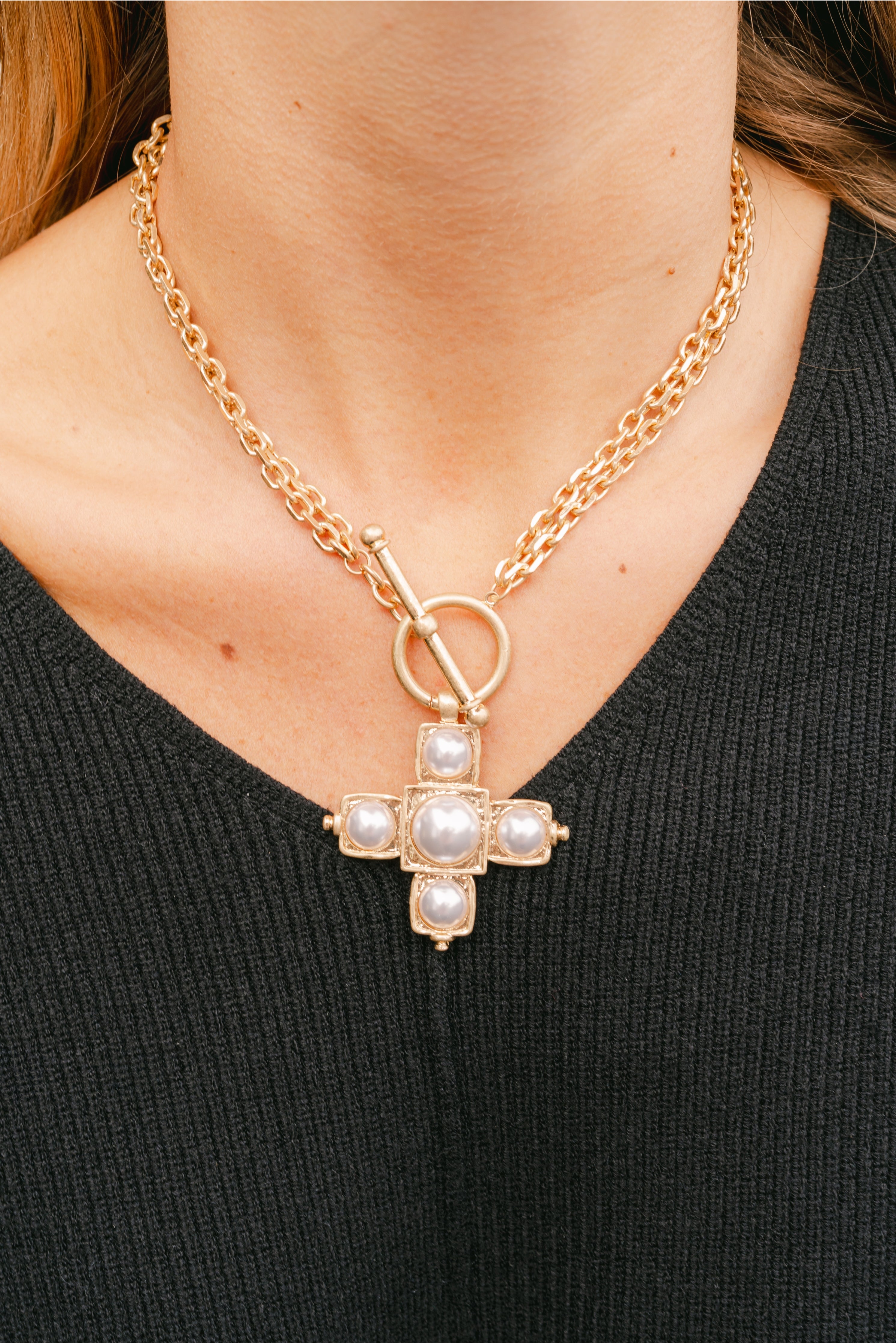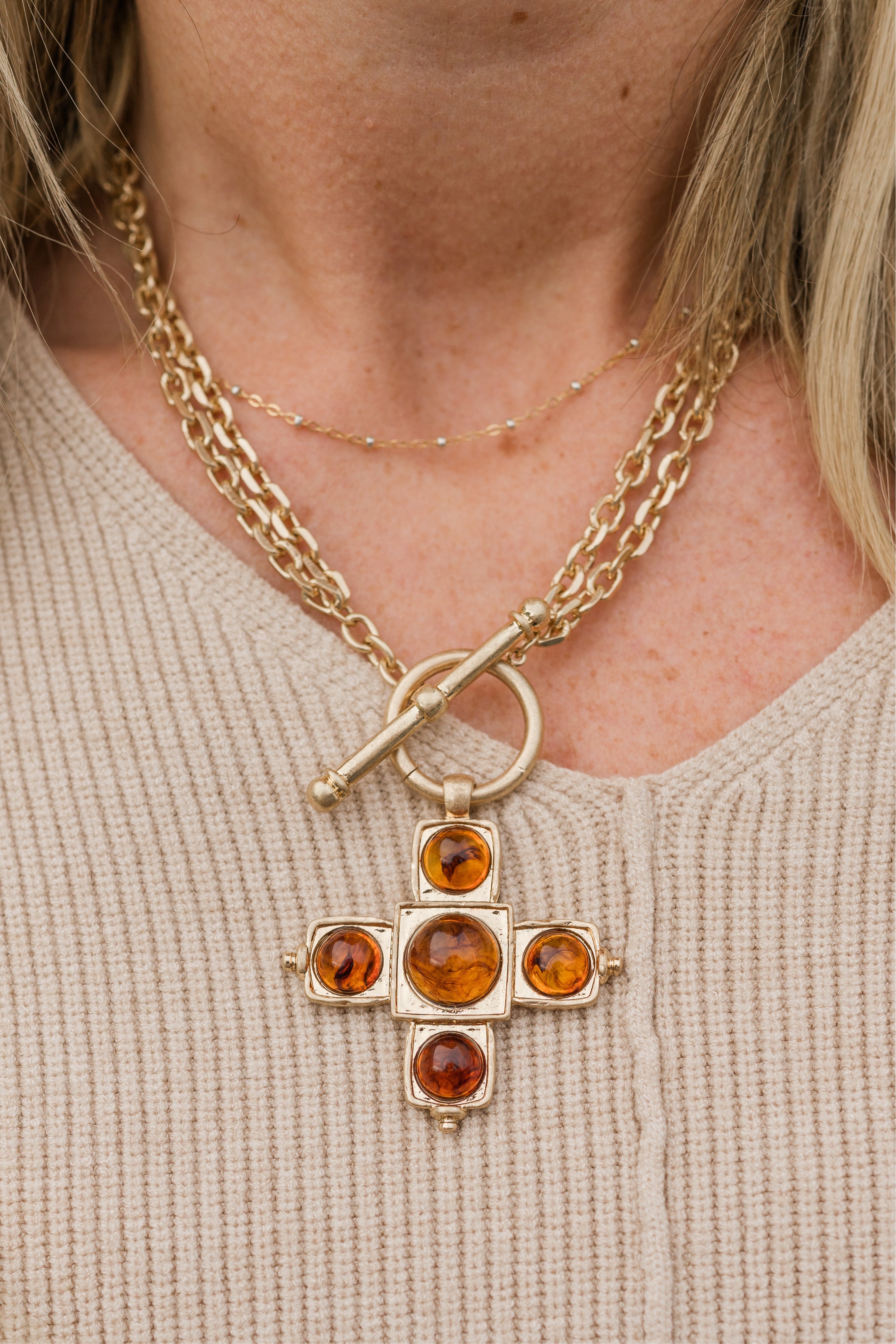 This elegant necklace set features a bold, textured chain paired with a striking cross-shaped pendant adorned with smooth, rounded stones. Finished with a classic toggle closure and matching stud earrings, it offers a refined, timeless look.