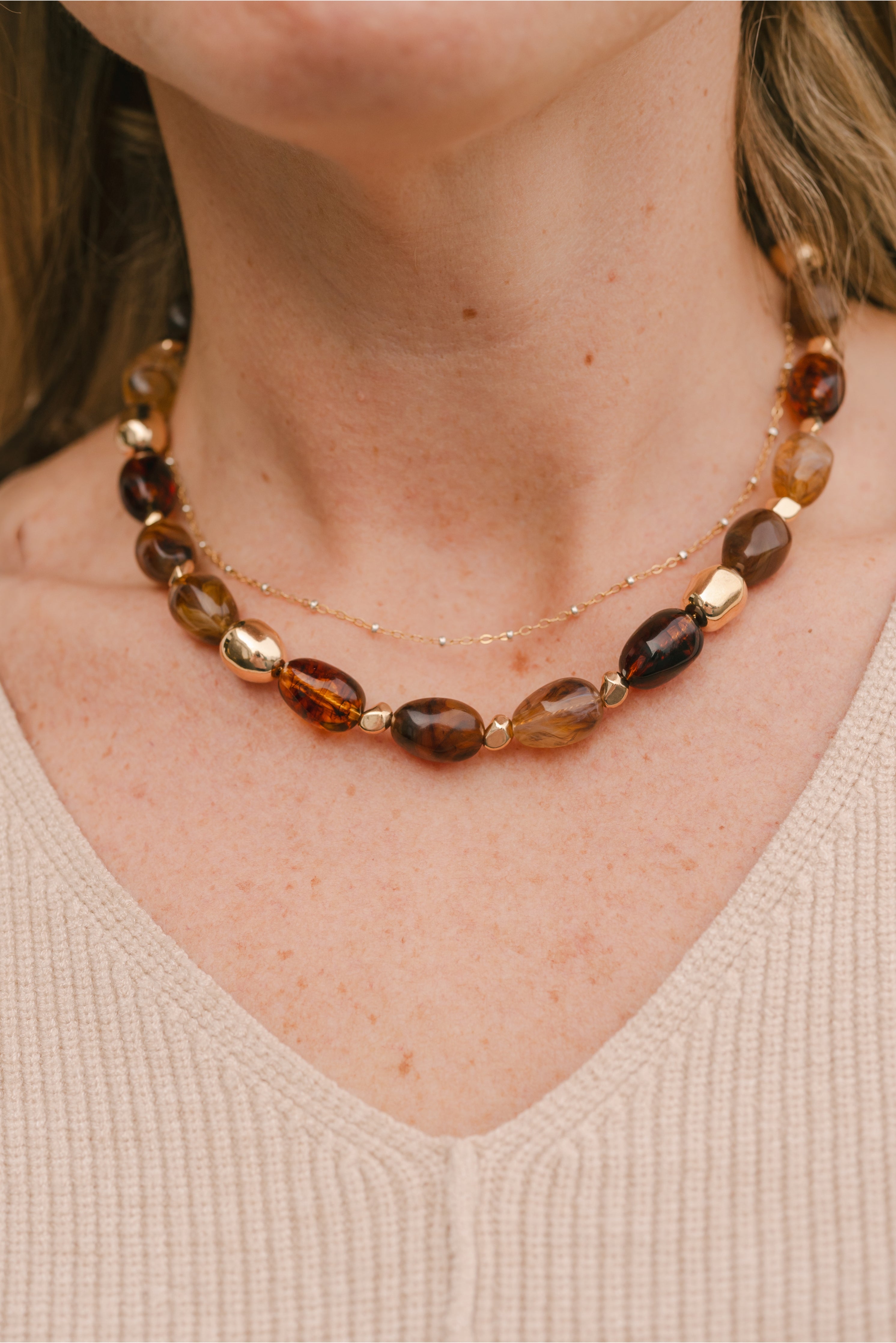 Elevate your everyday style with this beaded necklace, designed with smooth, organic-shaped beads and polished metal accents for a refined, nature-inspired look.