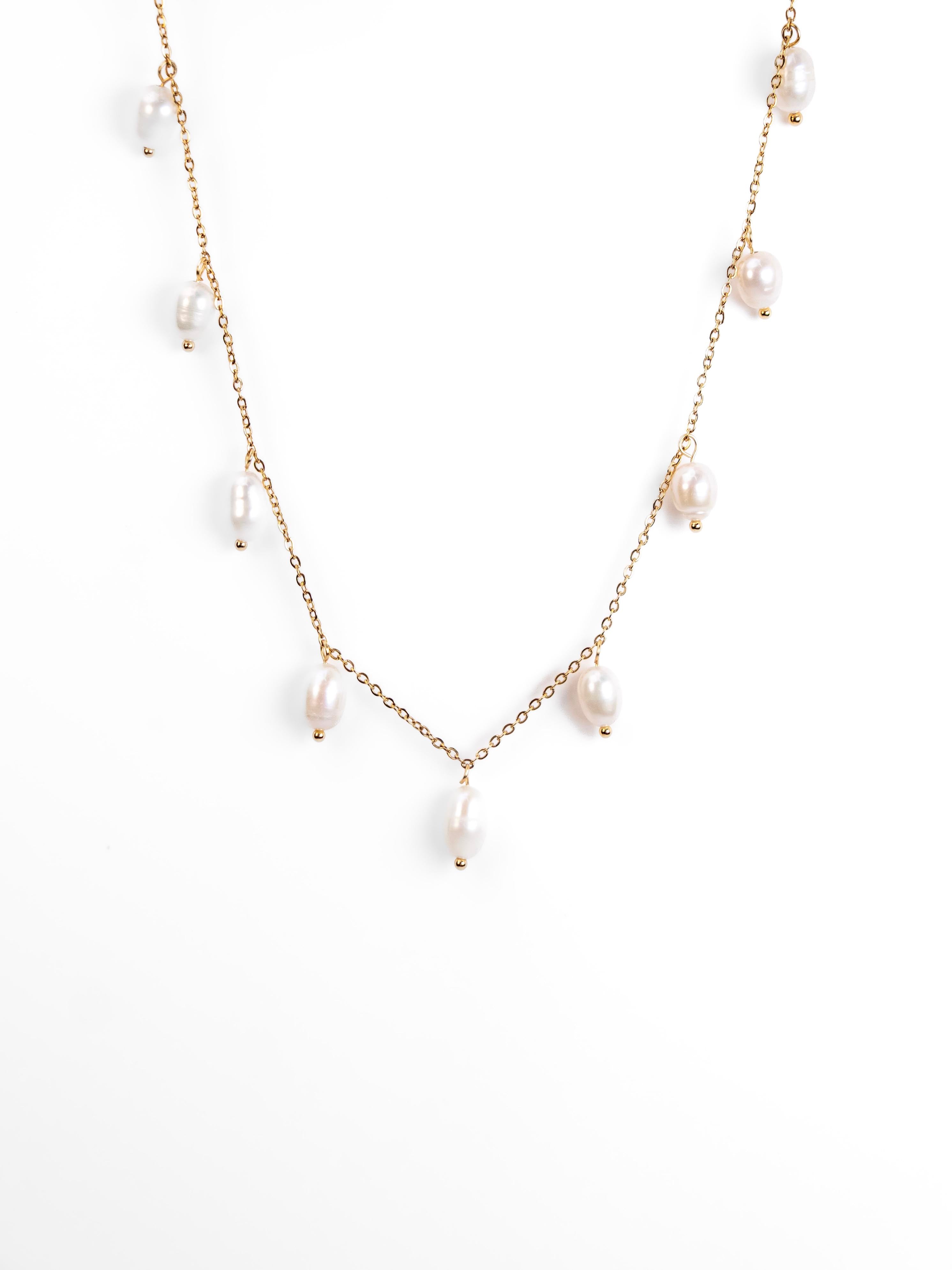 Delicate, feminine, and effortlessly chic — this necklace features a dainty gold chain adorned with evenly spaced freshwater pearl drops for a look that is both timeless and modern. Perfect for layering or wearing on its own, it adds a touch of elegance to any outfit.