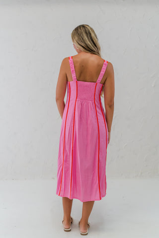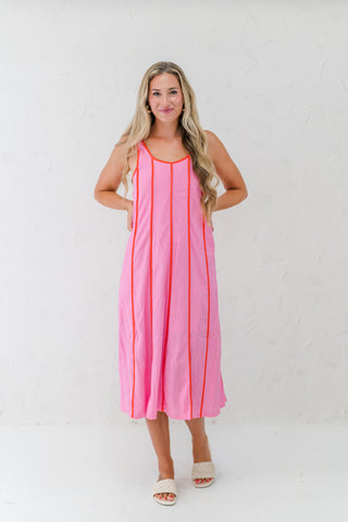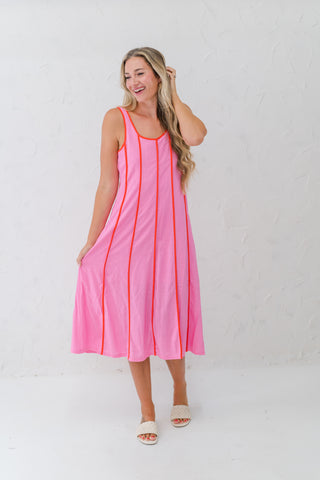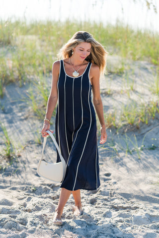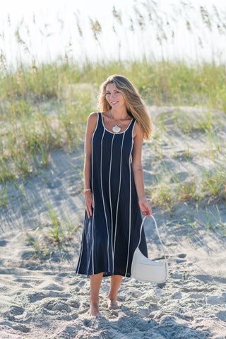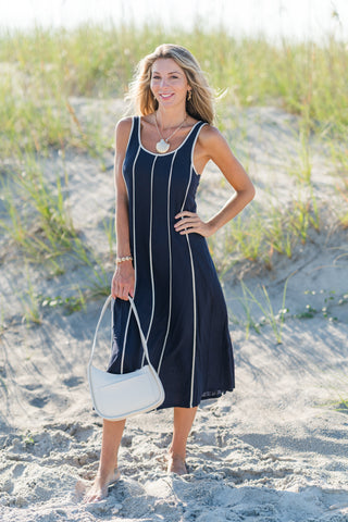 This Vertical Trim Sleeveless Dress features elongating contrast piping that flatters the silhouette and adds modern dimension. The flowy midi-length hem offers graceful movement, perfect for both casual days and dressier evenings. Its classic navy base and scoop neckline make it a versatile wardrobe staple.