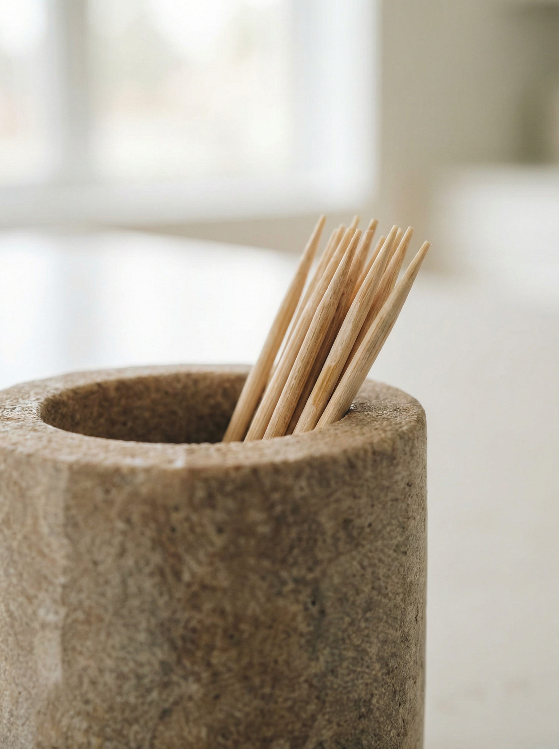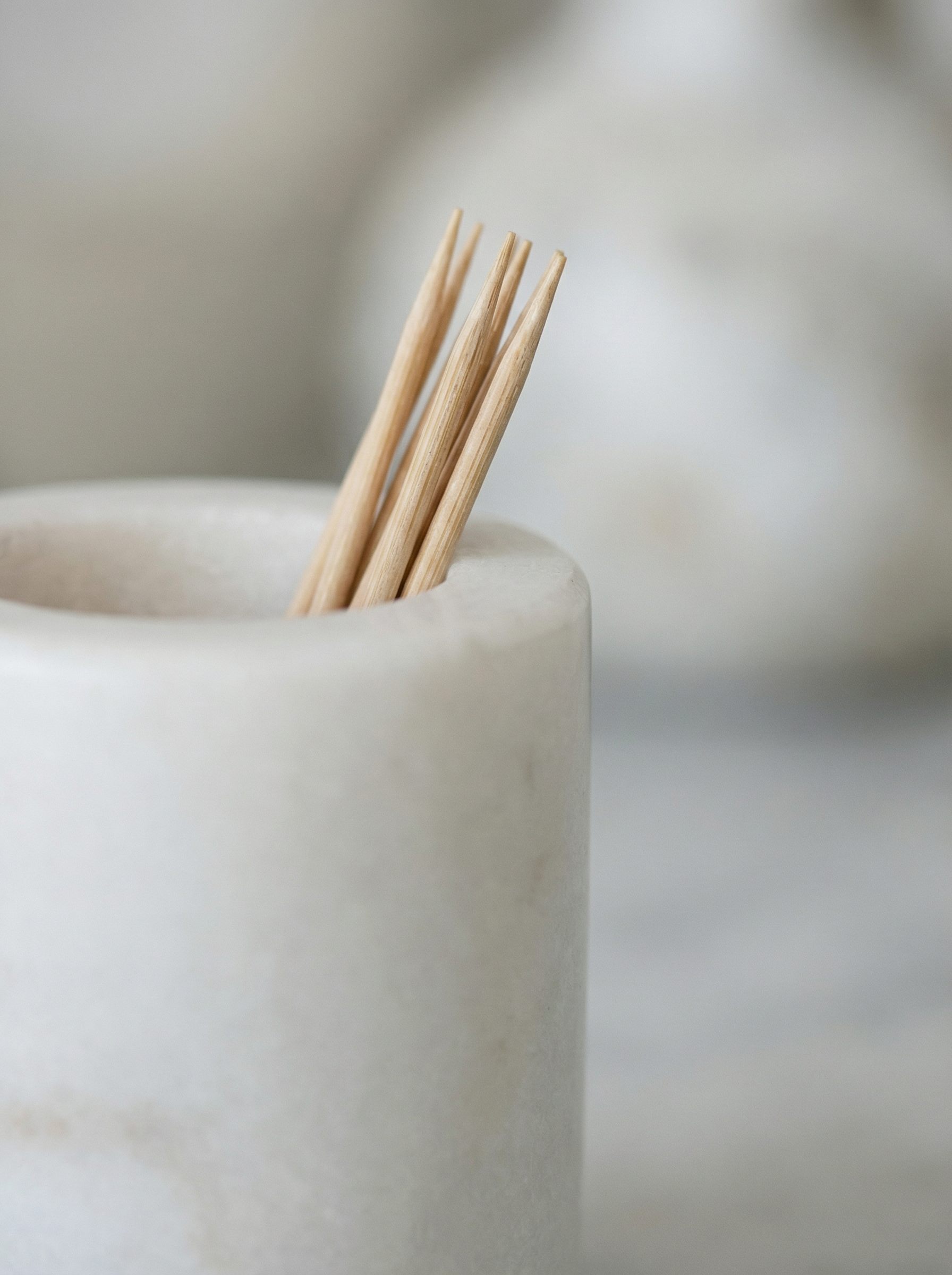 This marble toothpick holder showcases a clean, cylindrical silhouette with a naturally elegant feel. Each piece highlights the unique veining and variation of the stone, making it one of a kind.
