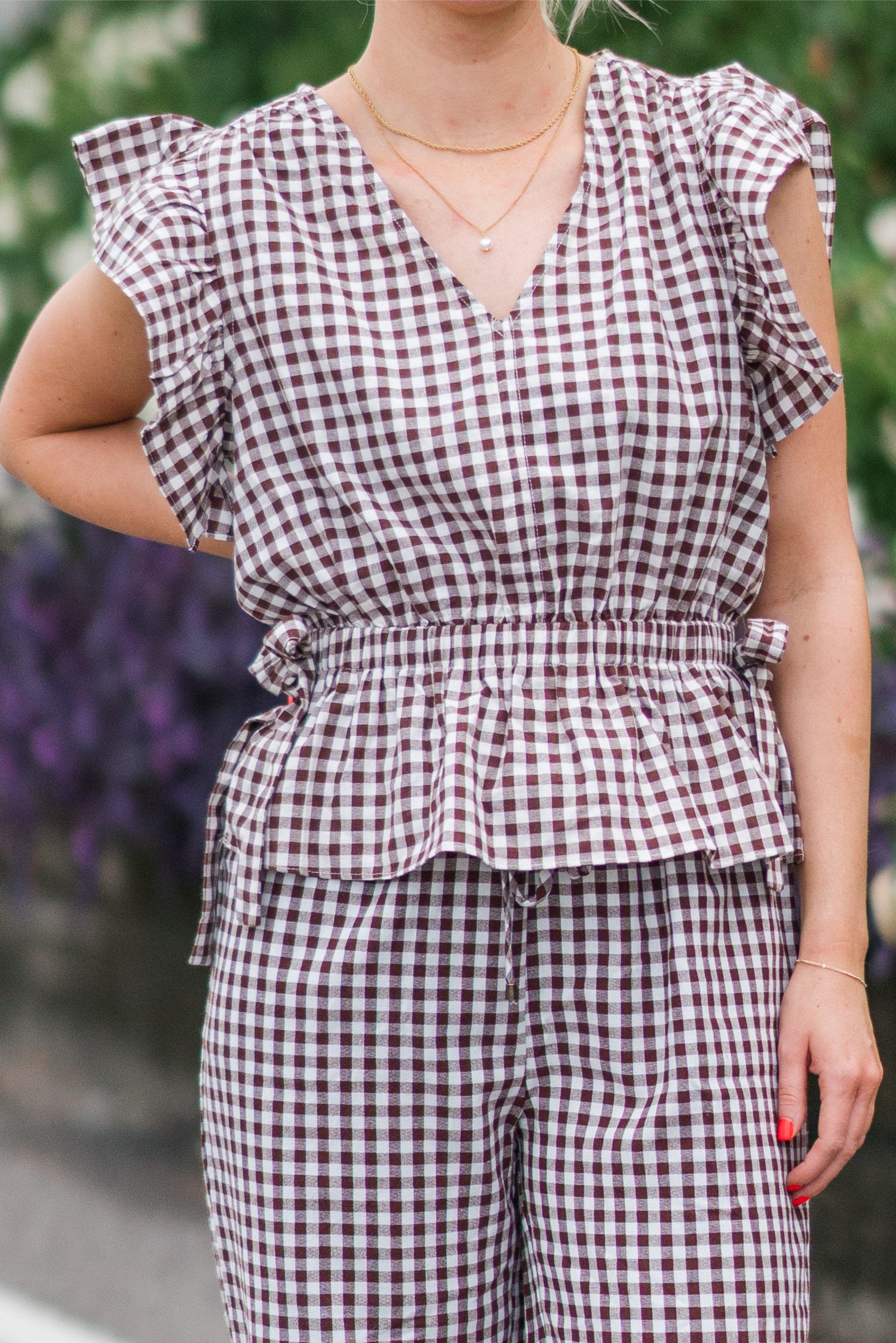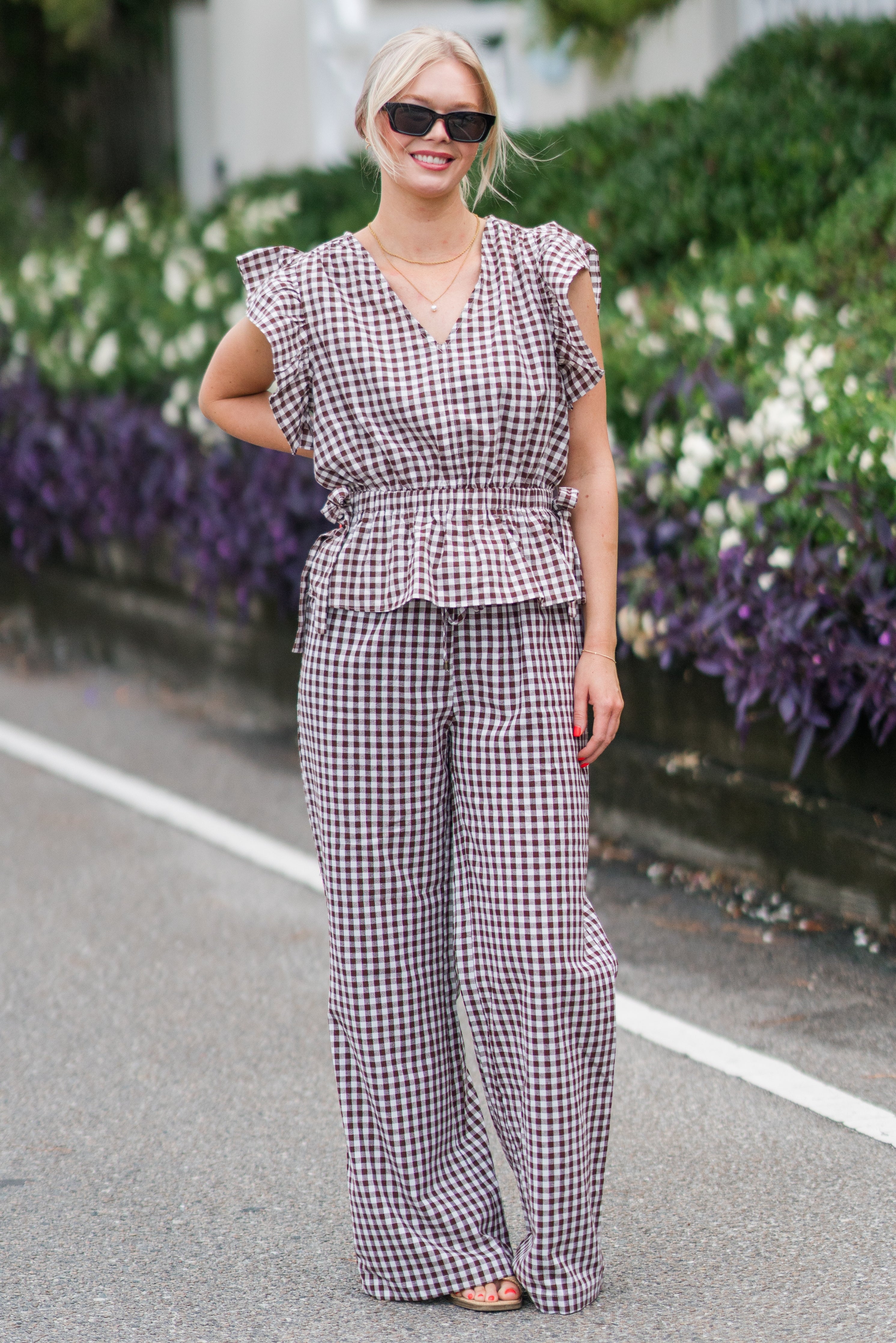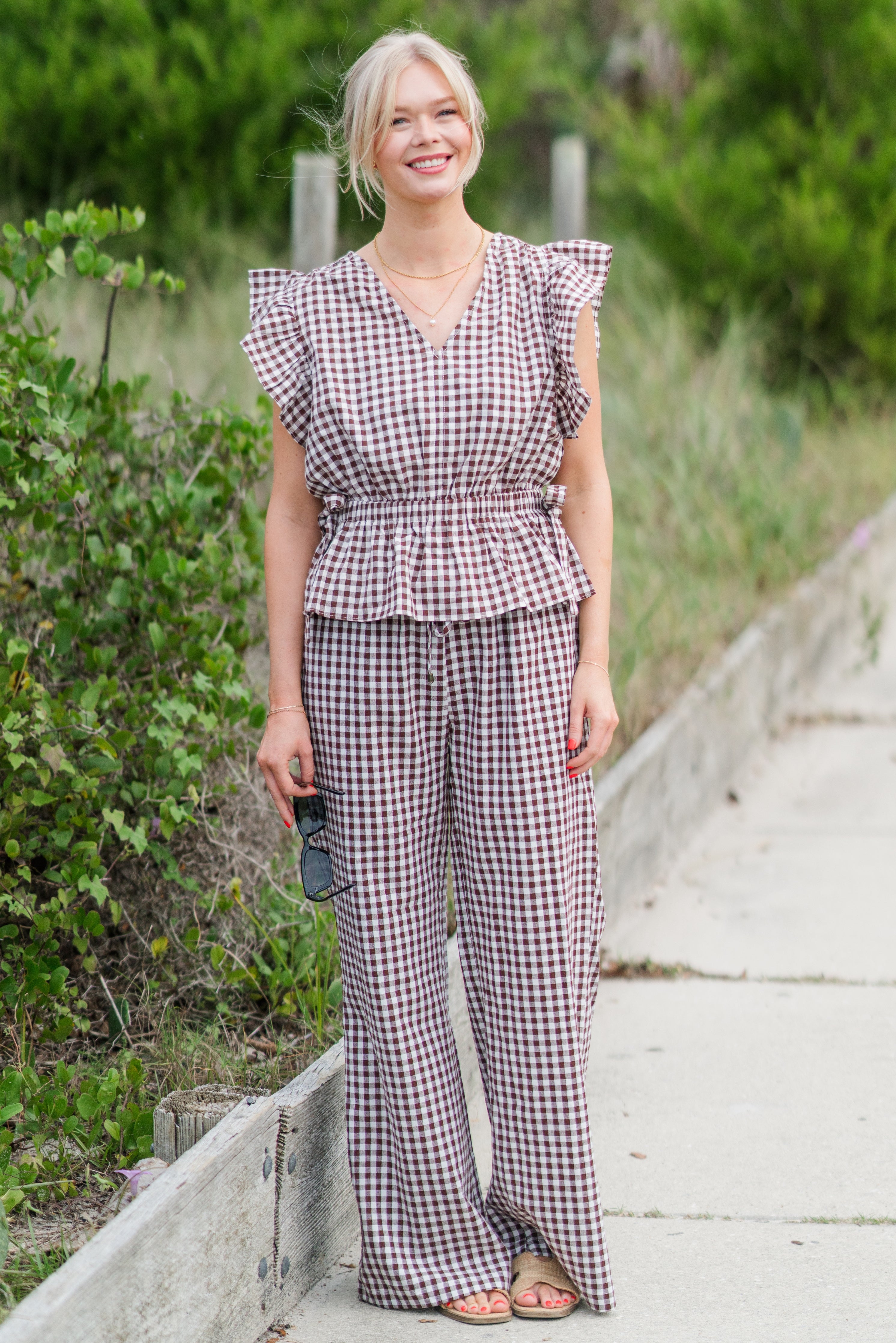 This sleeveless gingham top is a charming mix of playful and polished. Designed with ruffled shoulder details, a flattering V-neckline, and a cinched waist with tie accents, it creates a feminine silhouette.