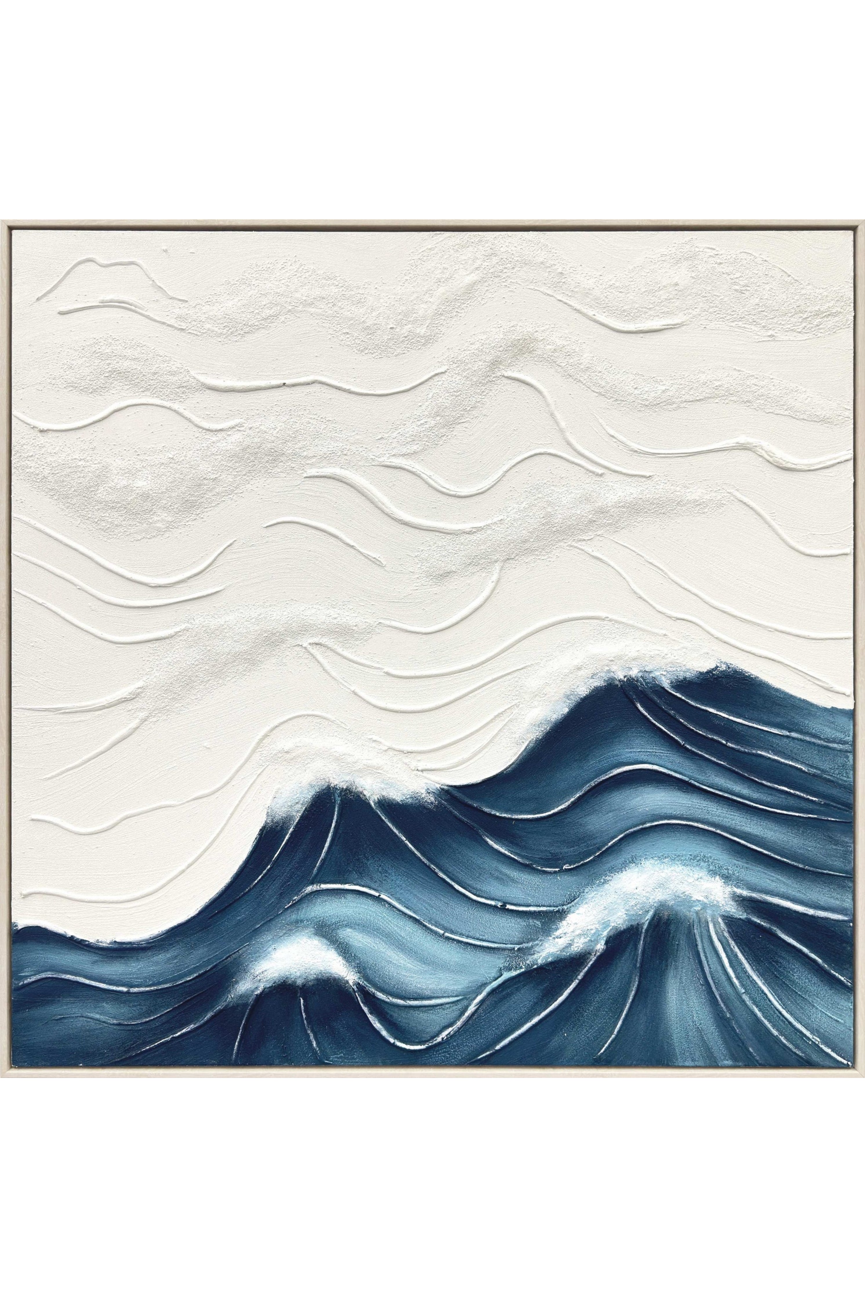 This painting presents a serene, minimalist seascape rendered in soft relief and layered texture. Gentle, sculpted lines ripple across an ivory sky, evoking drifting clouds and quiet movement, while below, deep blue and slate-toned waves rise and fall in rhythmic harmony. The ocean’s surface is carved with flowing contours, accented by delicate highlights that suggest foam and motion without turbulence.