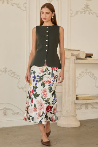 Botanical Print ¾ Sleeve Top with Contrast Tassel Tie V-neck