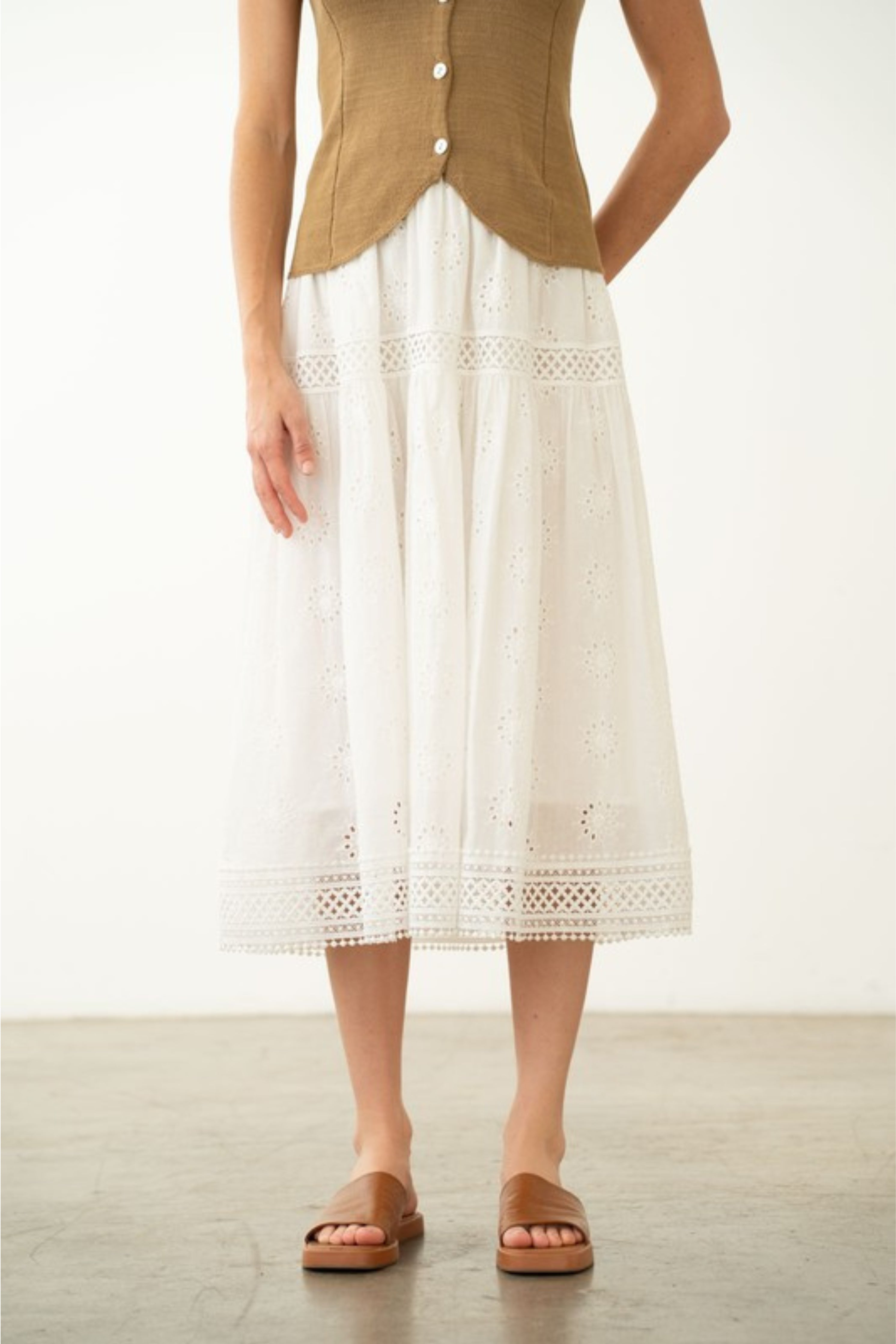 This midi-length skirt showcases delicate eyelet detailing with soft gathers for an airy, feminine drape. Finished with lace-trim accents and a comfortable waistband, it moves beautifully with every step.