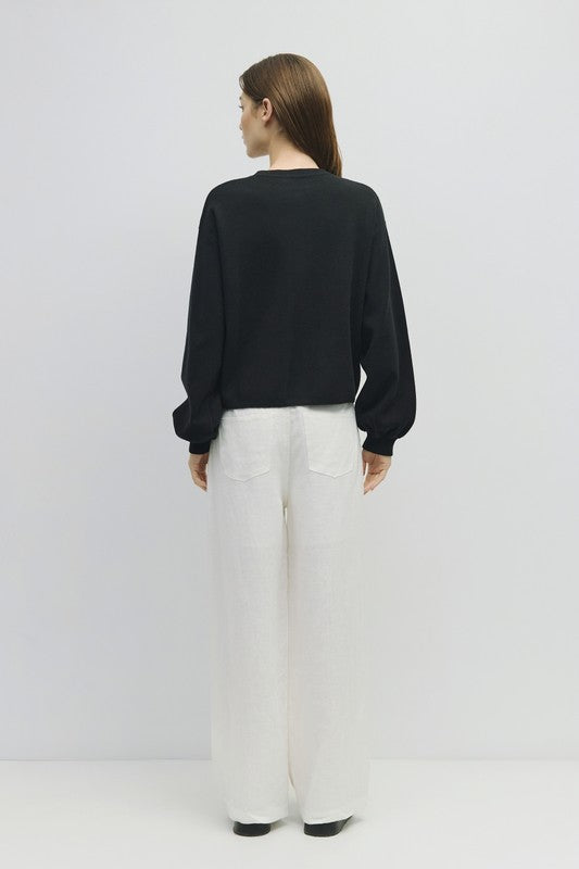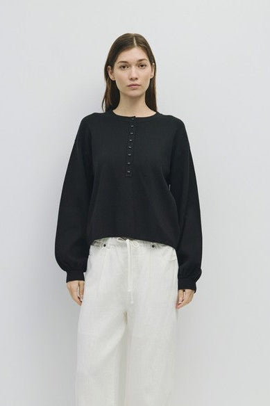 Effortlessly relaxed and minimal, this Semi-Cropped Henley Knit Long Sleeve Top brings comfort and sophistication together. Designed with a classic crew neckline, subtle front button placket, and soft, drapey sleeves, it’s perfect for casual days or laid-back layering.
