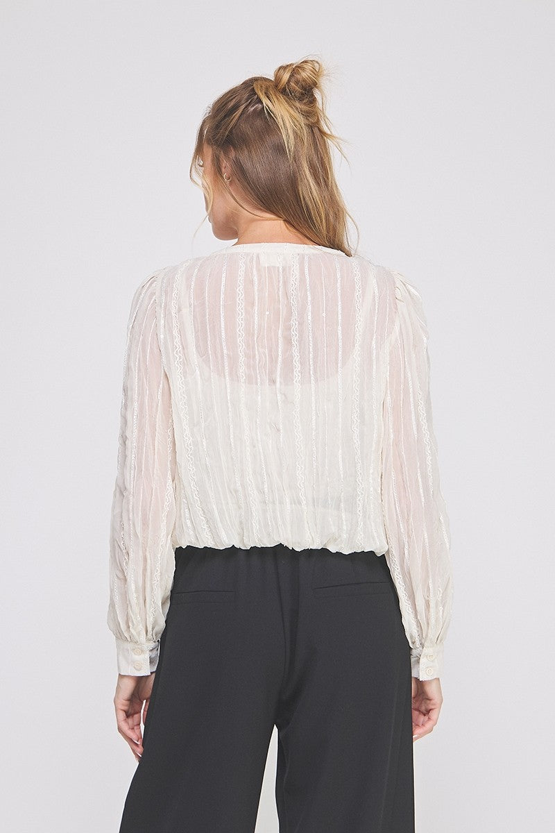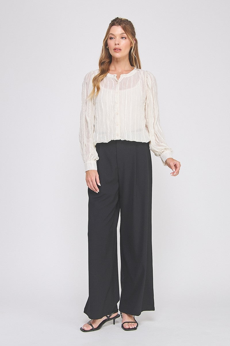 Delicate and effortlessly feminine, this Sheer Embroidered Button Down Blouse features a soft, airy fabric with subtle embroidered detailing throughout. Designed with long billowy sleeves, buttoned cuffs, and a relaxed silhouette, it’s perfect for elevating both casual and dressy looks.