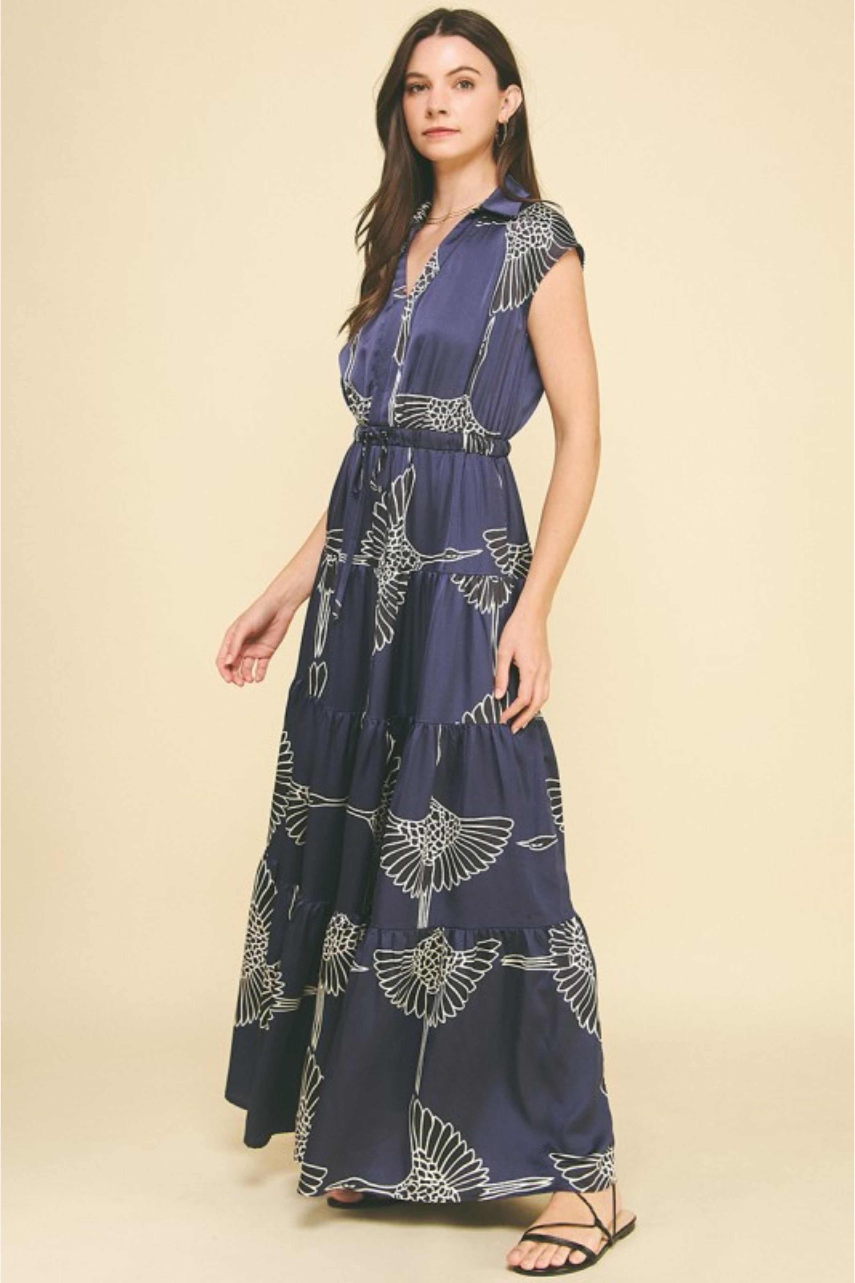 Make a statement with this Printed Tiered Maxi Dress, featuring a graceful bird motif that adds movement and charm. Designed with a collared neckline, button-front detail, and a drawstring waist for a flattering fit, this dress flows effortlessly into a tiered skirt that sways with every step.
