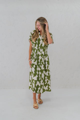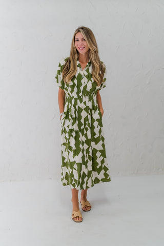 Elevate your wardrobe with the Geometric Button Down Maxi Dress, designed for effortless style and comfort. Its bold geometric pattern adds a modern edge, while the button-down front and short sleeves offer a flattering, breathable fit perfect for warm days.