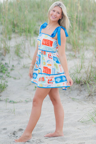 Add a splash of sunshine to your wardrobe with the Paradise Tie Strap Mini Dress, featuring a cheerful tropical patchwork print and playful shoulder bows. The square neckline, tiered silhouette, and vibrant blue trim give this mini a flirty, feminine vibe perfect for warm-weather adventures.