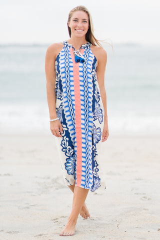 This tassel tie halter midi dress features a bold, artistic print in vibrant blues and corals for a statement-making look. The halter neckline is accented with playful tassel ties, adding a touch of bohemian charm.