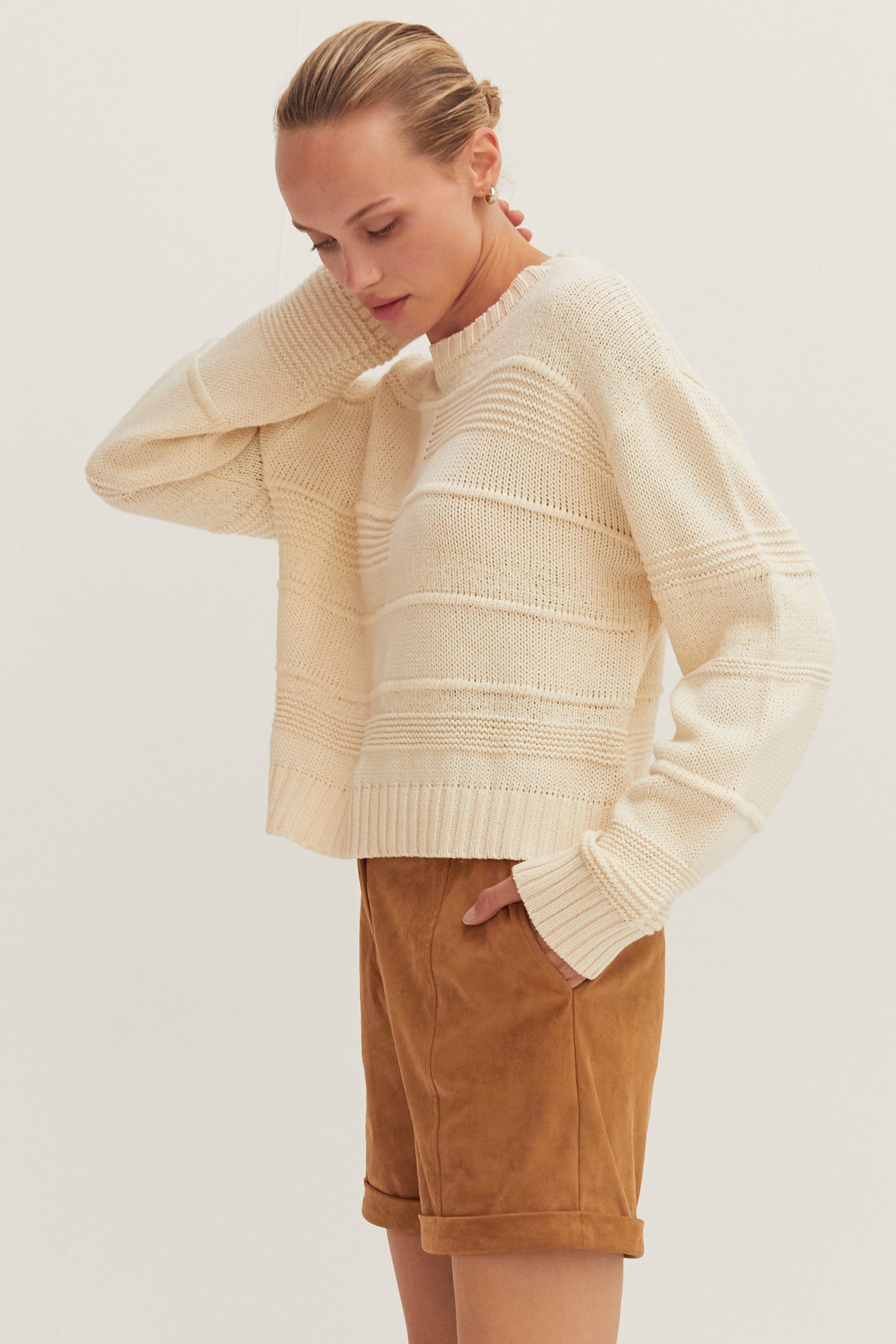 Elevate your everyday wardrobe with this effortlessly chic crewneck sweater. Designed with a relaxed fit and a modern cropped length, it features a unique shadow stripe knit that adds subtle dimension and texture.