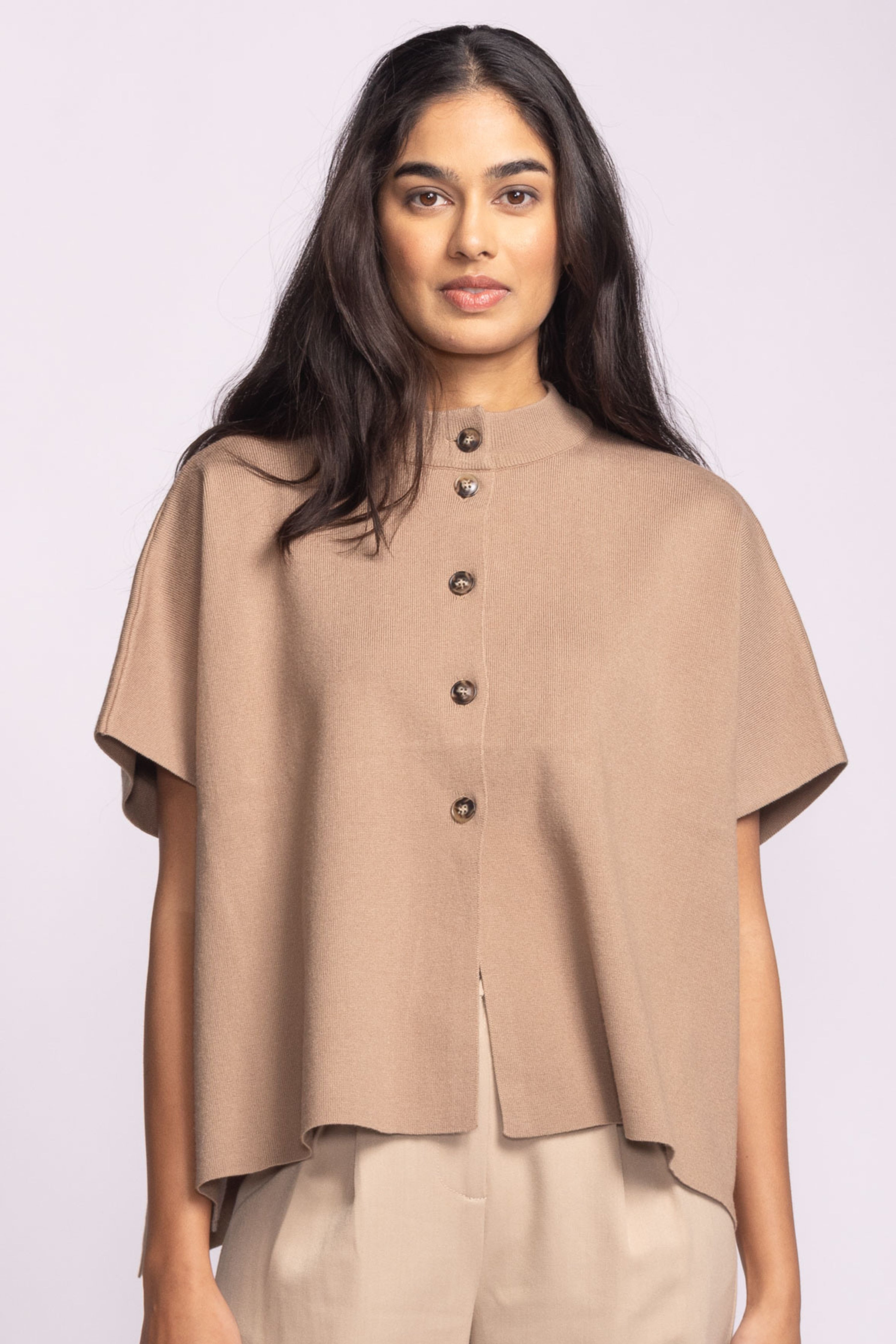 Elevate your everyday layers with this refined button-up knit poncho top. Designed with a relaxed, draped silhouette and short sleeves, it blends comfort with effortless sophistication. The front button detail adds a classic touch, while the soft knit fabric offers cozy warmth and a polished finish—perfect for pairing with trousers or denim alike.