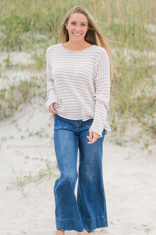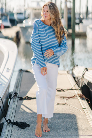 This striped detail sweater brings a timeless nautical touch to your wardrobe with its navy and white knit pattern. Designed with a soft round neckline and relaxed fit, it’s perfect for breezy coastal days or layering year-round.