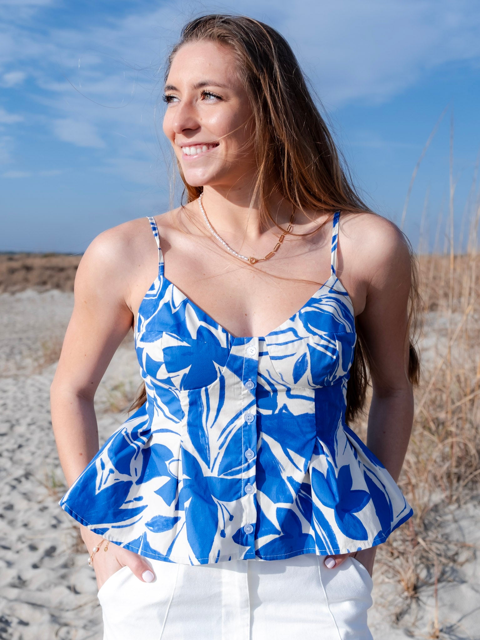 This tank top features a fitted bodice with slim shoulder straps and a button-front design. A softly flared hem creates a flattering peplum silhouette, adding shape and movement to the look.