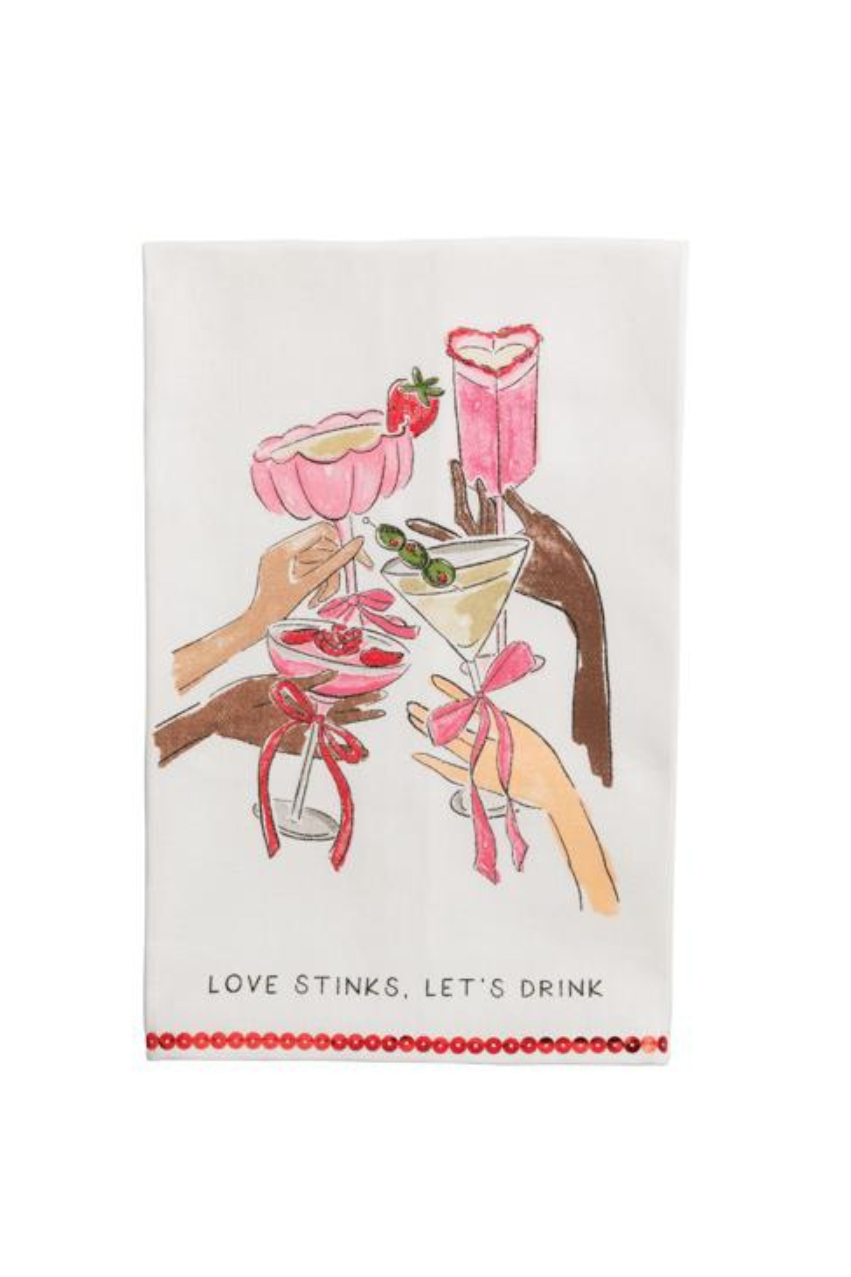 Elevate your kitchen or bar area with this charming Drinks Valentines Cotton Towel. The delightful sequin trim adds a touch of sparkle and elegance, making it an ideal accessory for Valentine's Day celebrations or as a thoughtful gift for a loved one.