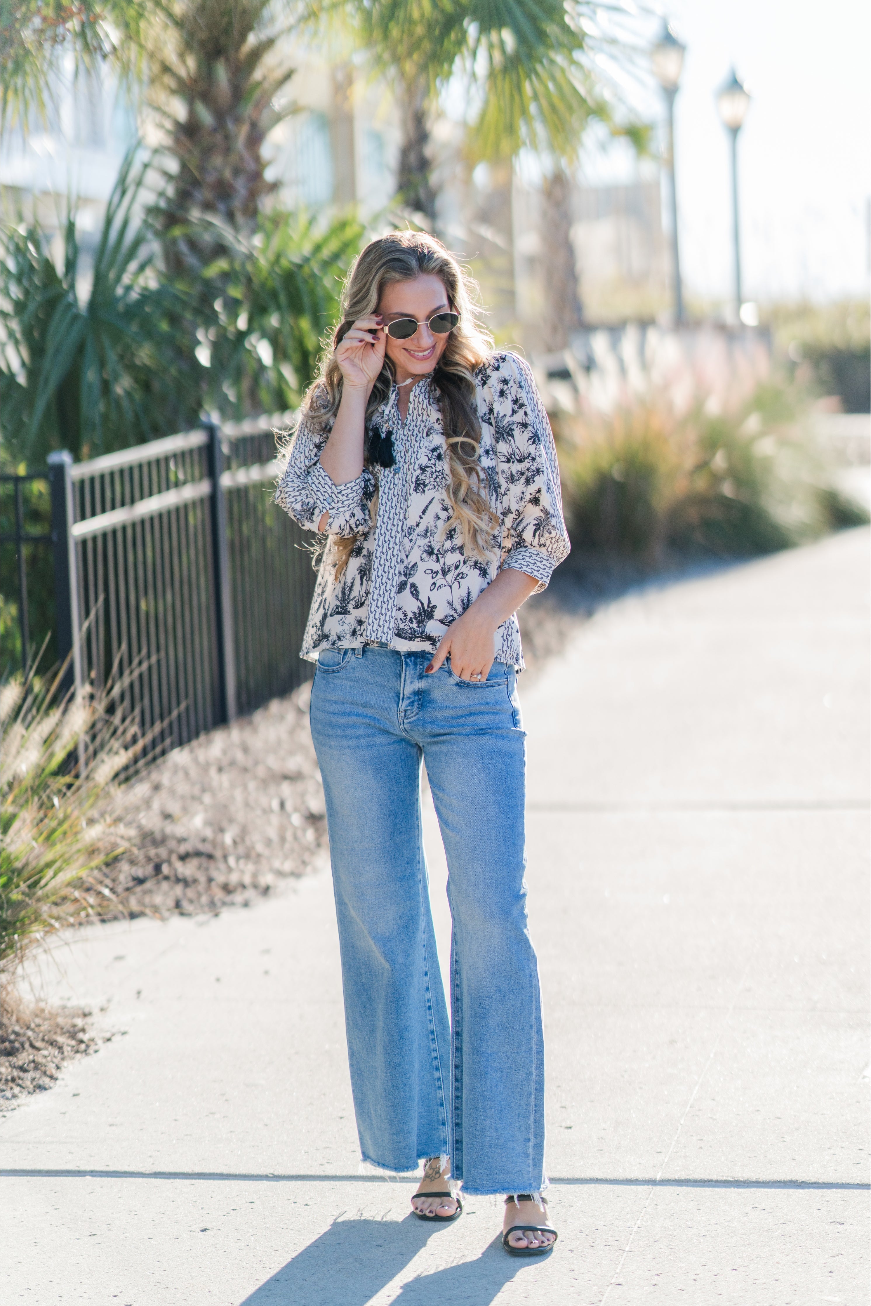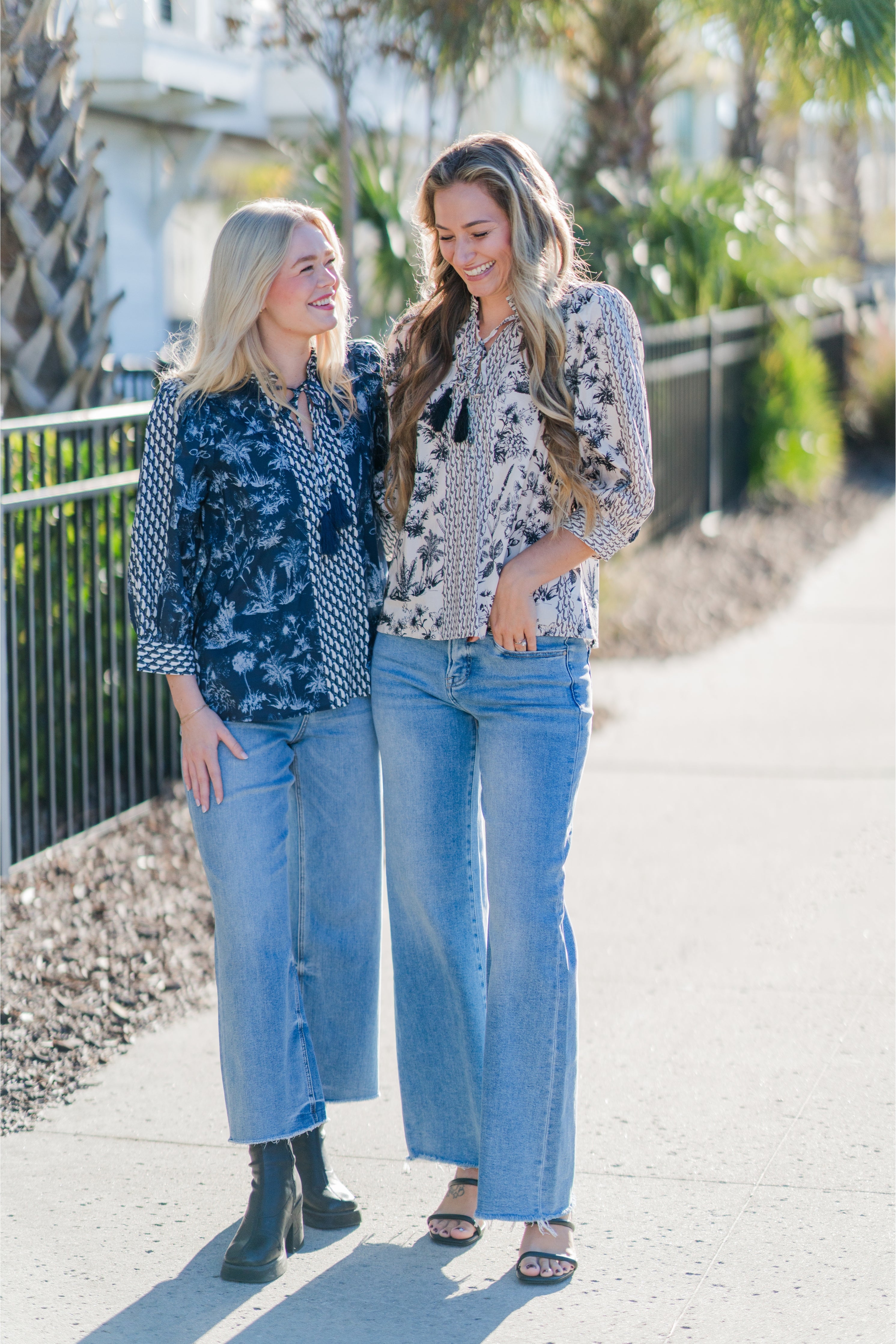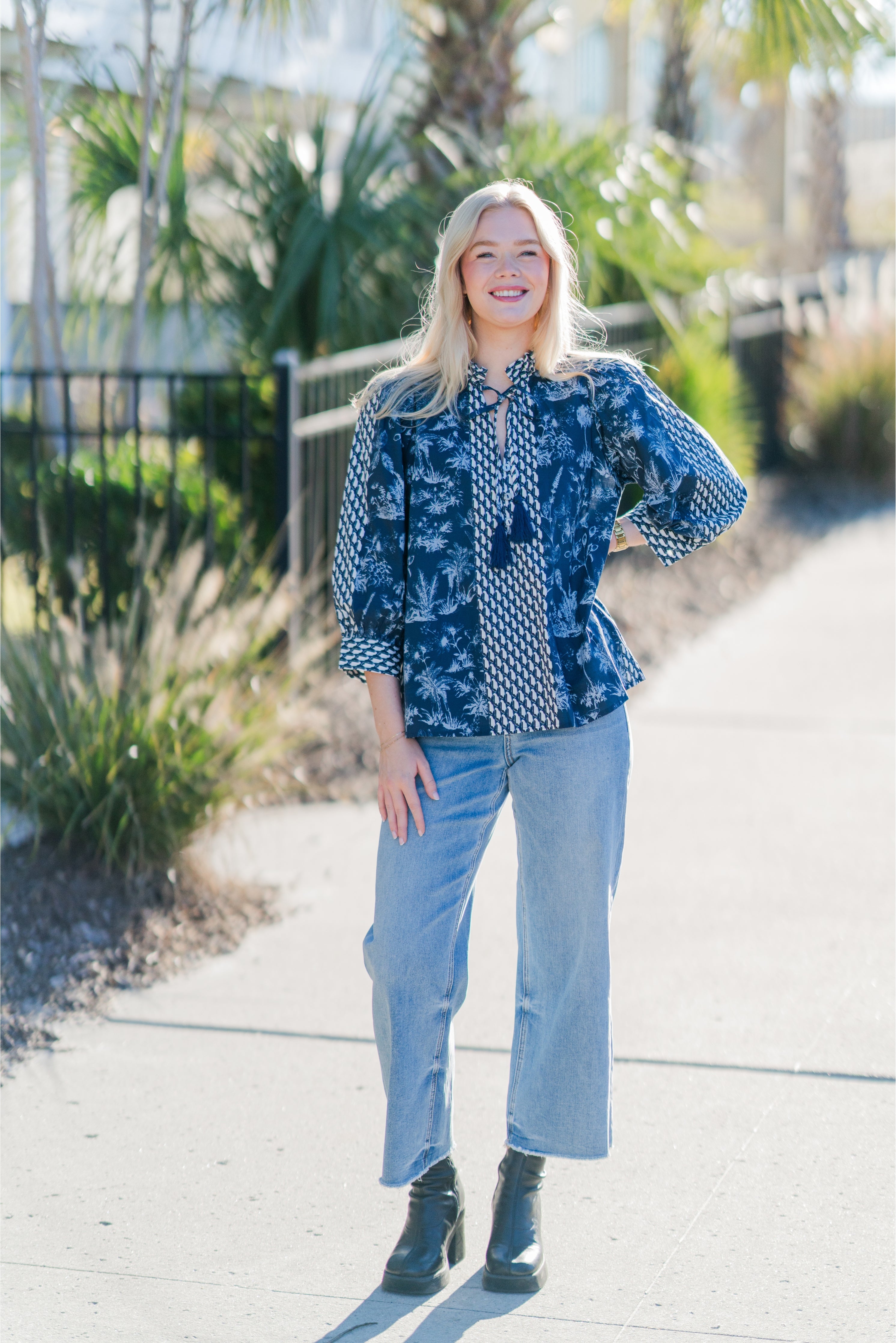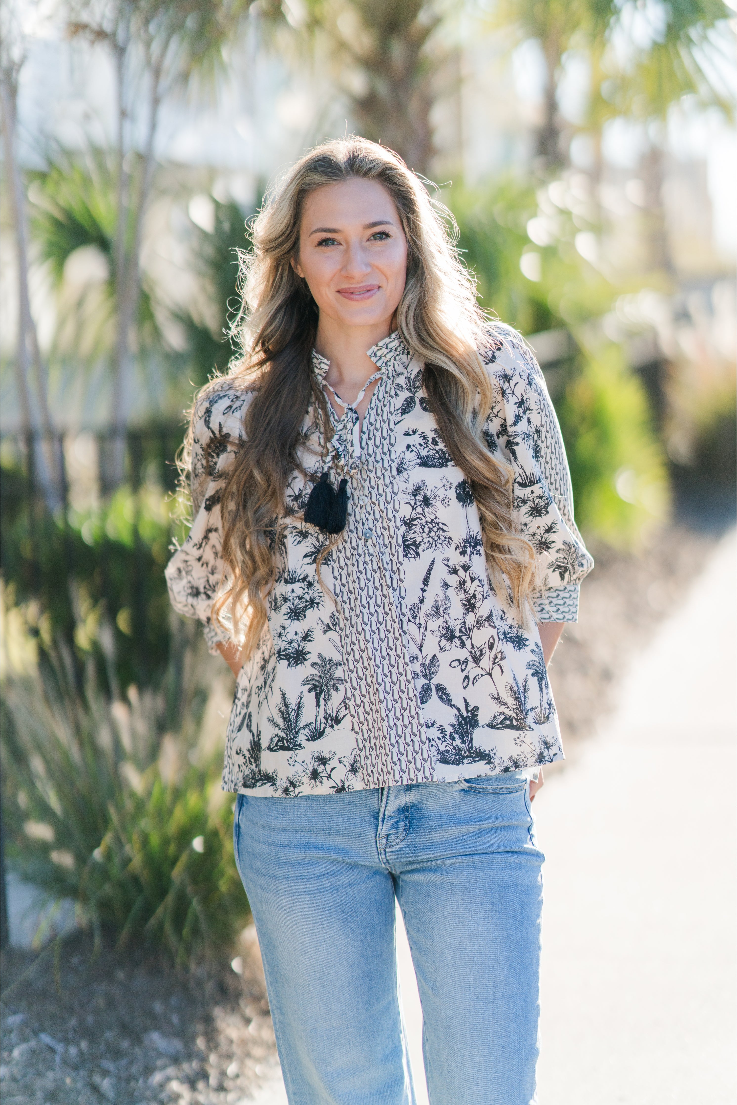 Bring effortless sophistication to your wardrobe with this mixed print blouse. Designed with an artful blend of patterns, it features a split neckline with tassel ties, puffed ¾ sleeves, and gathered detailing for a feminine finish.