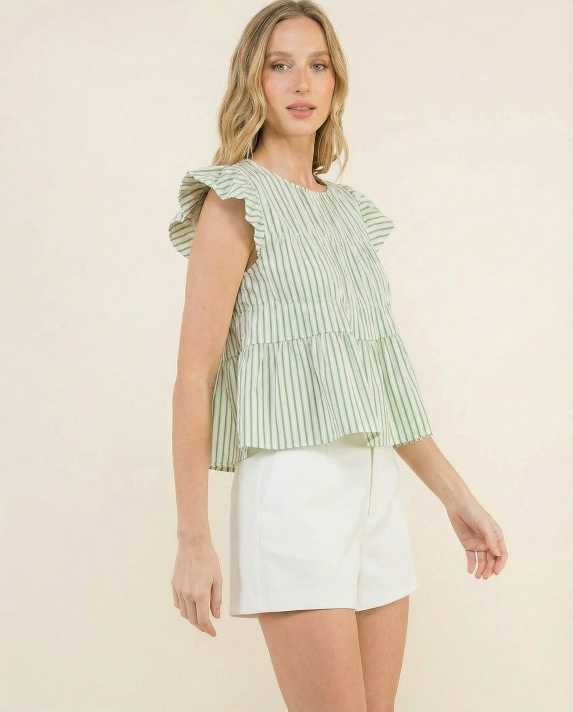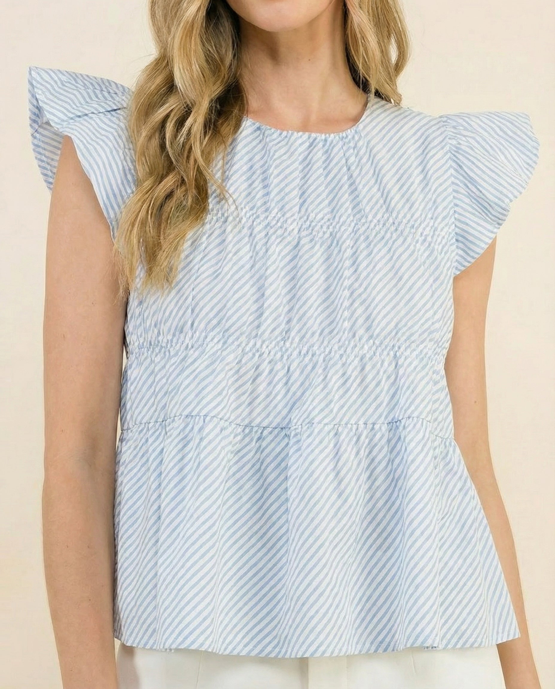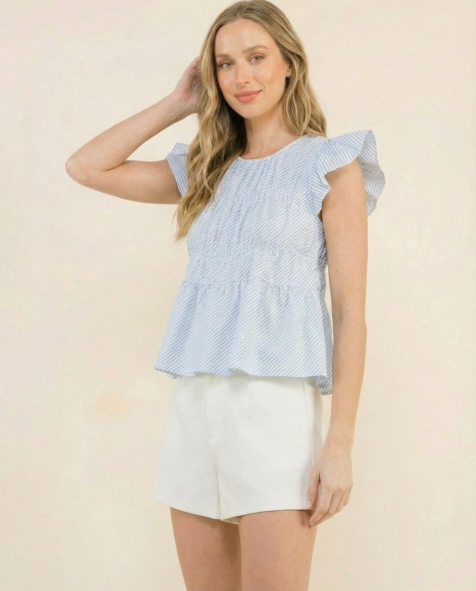 Coastal Stripe Ruffle Top brings an effortless, breezy feel to your everyday wardrobe. Designed with soft vertical stripes and delicate ruffle sleeves, this lightweight cotton top adds a feminine touch while keeping the look relaxed and easy to wear.