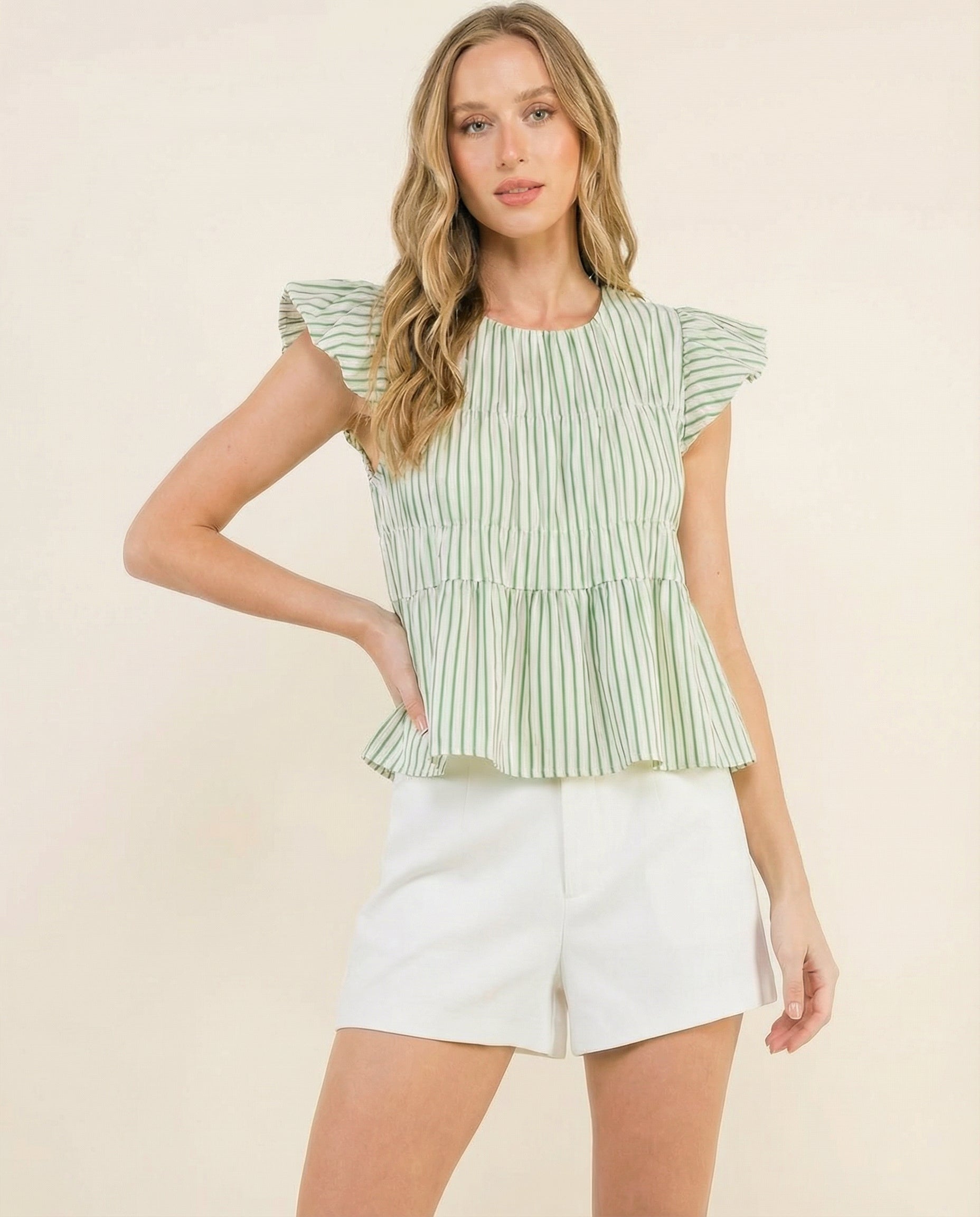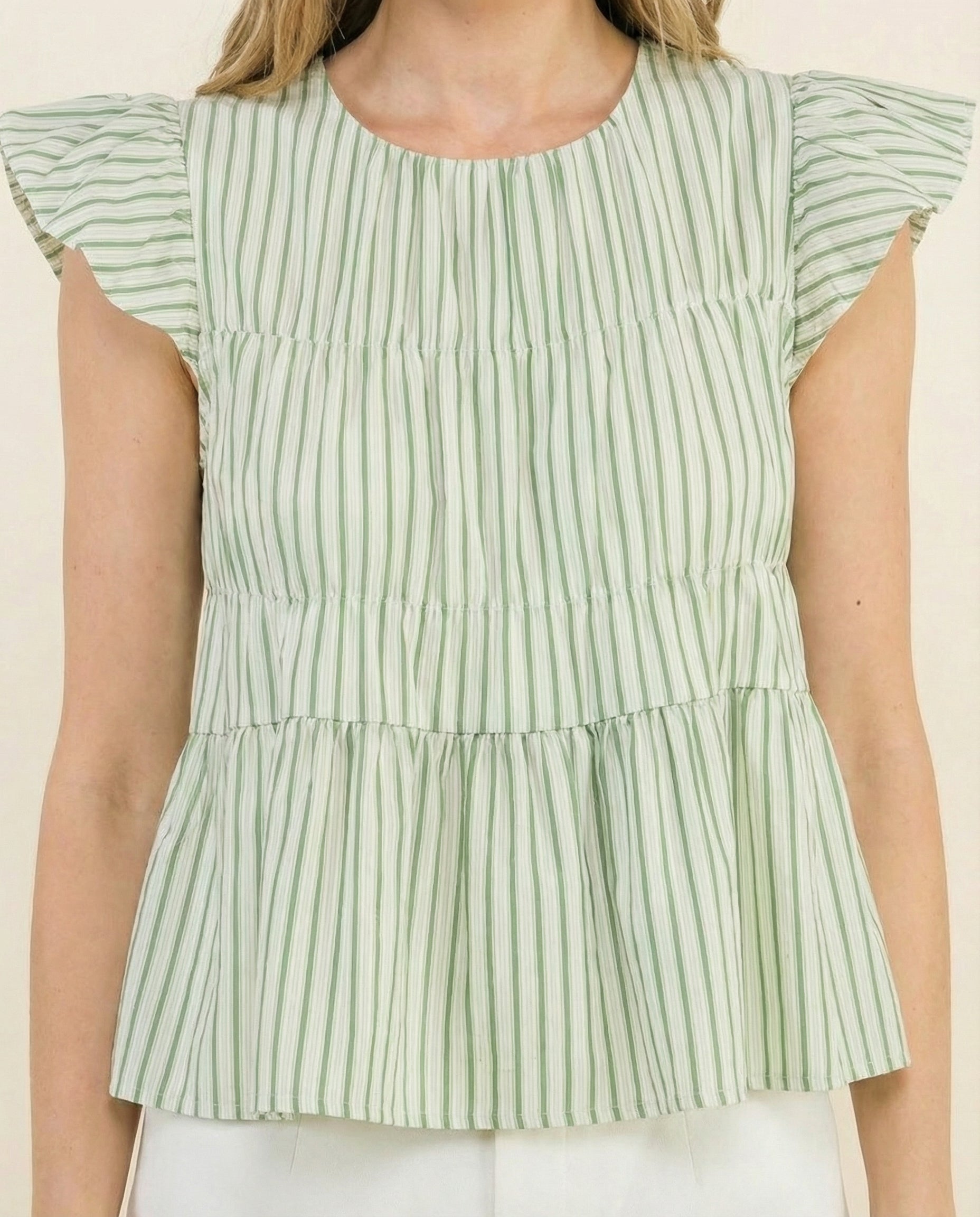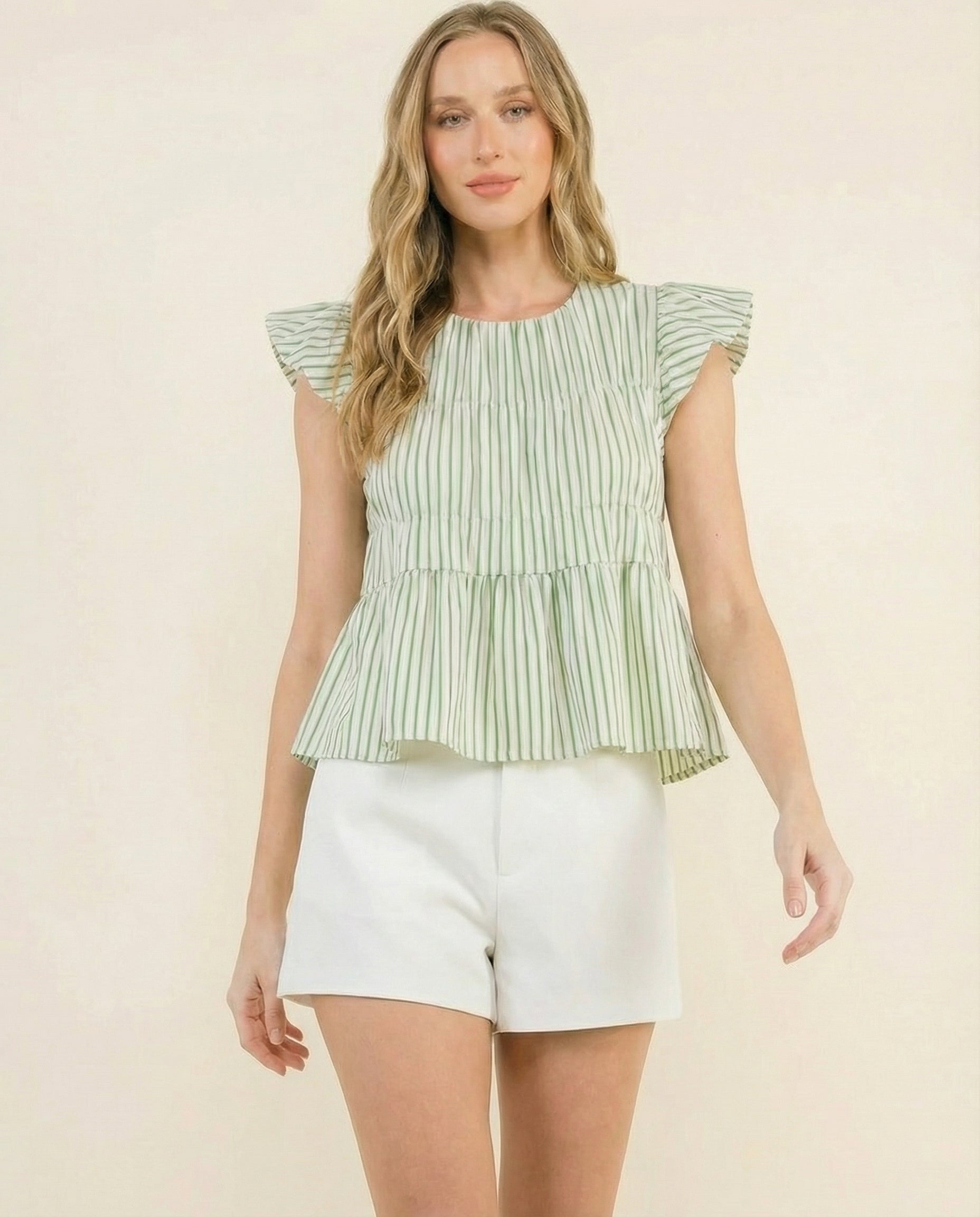 Coastal Stripe Ruffle Top brings an effortless, breezy feel to your everyday wardrobe. Designed with soft vertical stripes and delicate ruffle sleeves, this lightweight cotton top adds a feminine touch while keeping the look relaxed and easy to wear.
