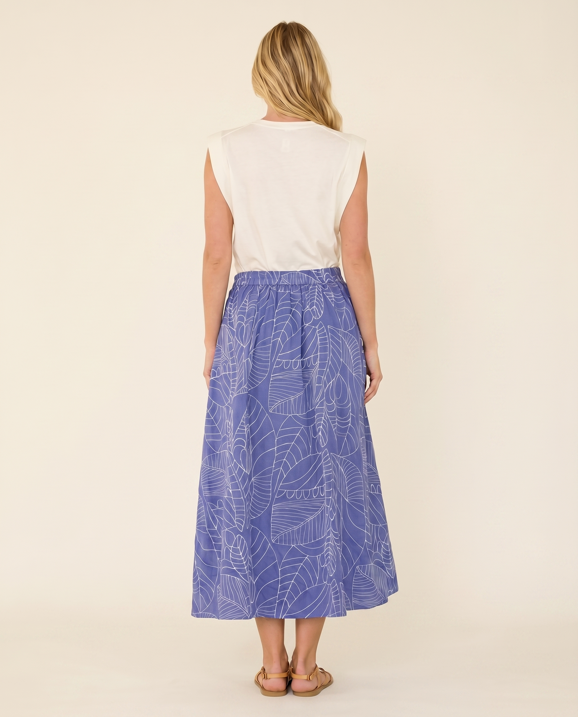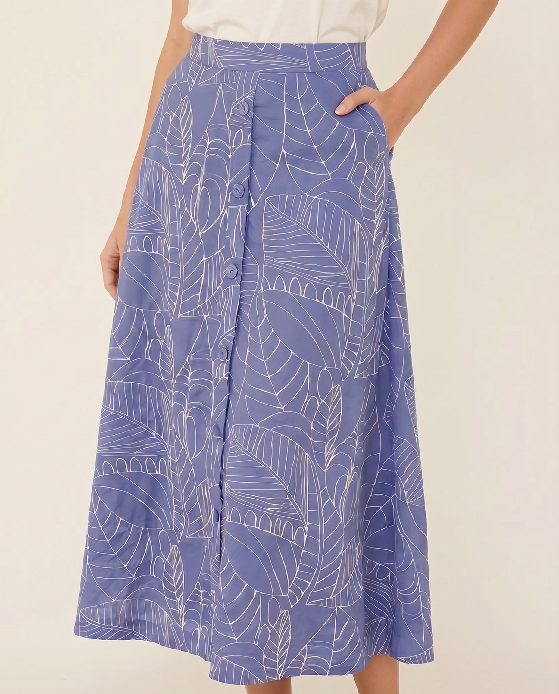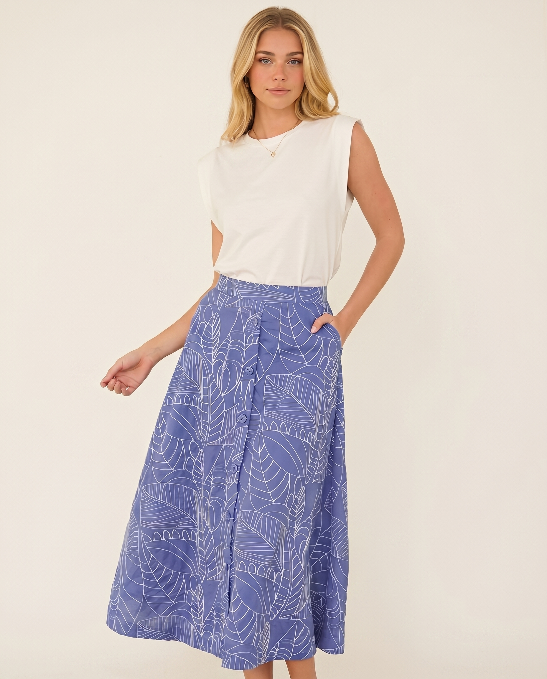 A full button-front placket adds classic structure, while the flowing shape keeps the look relaxed and easy to style. Designed to pair seamlessly with everything from fitted tees to lightweight knits, this skirt transitions effortlessly from day to night.