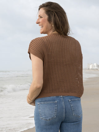 The Open Knit Sweater Tee features a lightweight open-knit design with a relaxed fit and short sleeves. It's breathable and effortless—perfect over a tank or swimsuit, paired with denim or tucked into your favorite shorts. Ideal for spring days, beach weekends, or casual layering all year long.