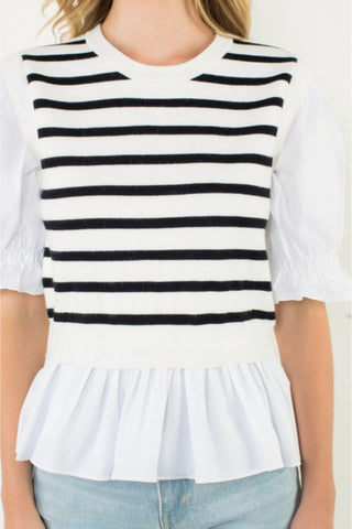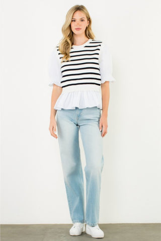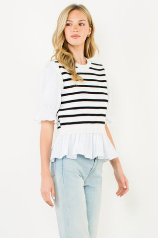 This Striped Peplum Puff Sleeve Blouse is a chic blend of playful charm and timeless style. Featuring bold horizontal stripes and feminine puff sleeves, it’s finished with a flouncy peplum hem for a flattering silhouette.
