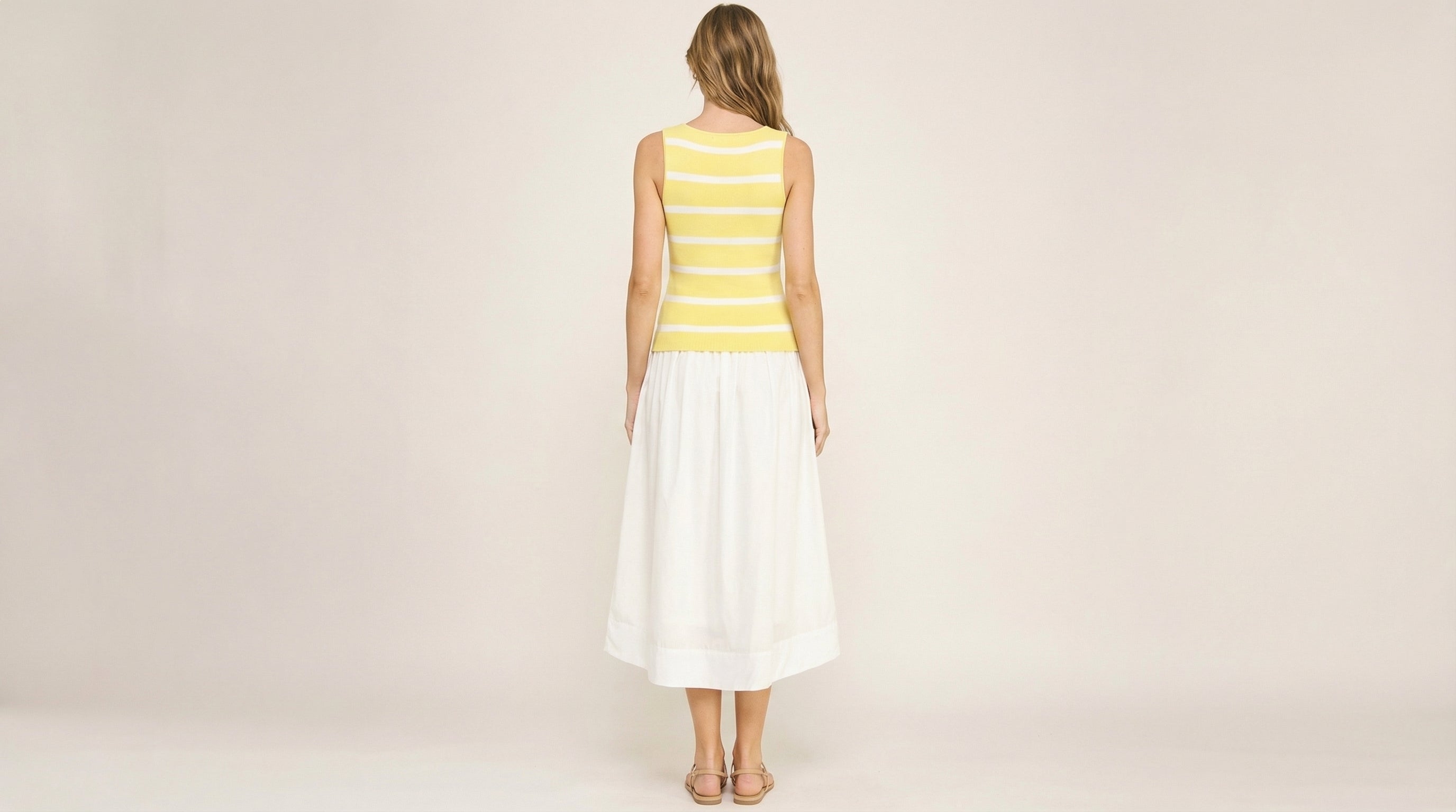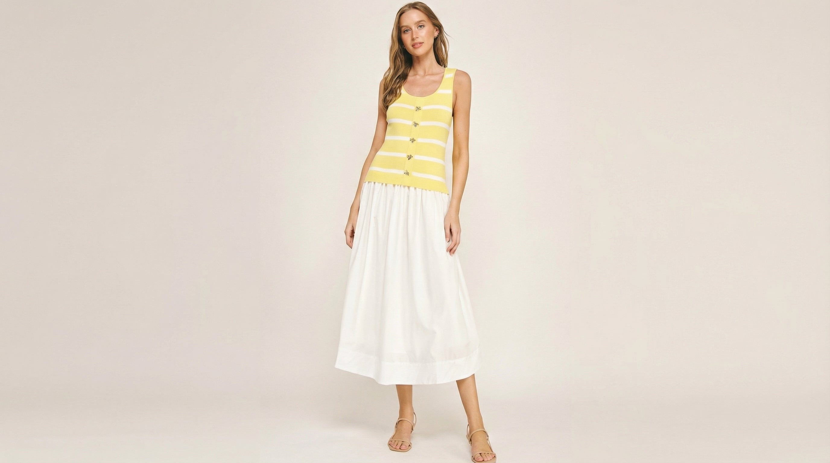 Sunlit Stripe Midi Dress brings bright, effortless style to warm-weather days. Featuring a fitted knit bodice with cheerful yellow and white stripes, this dress is accented with delicate gold button details that add a subtle touch of shine.