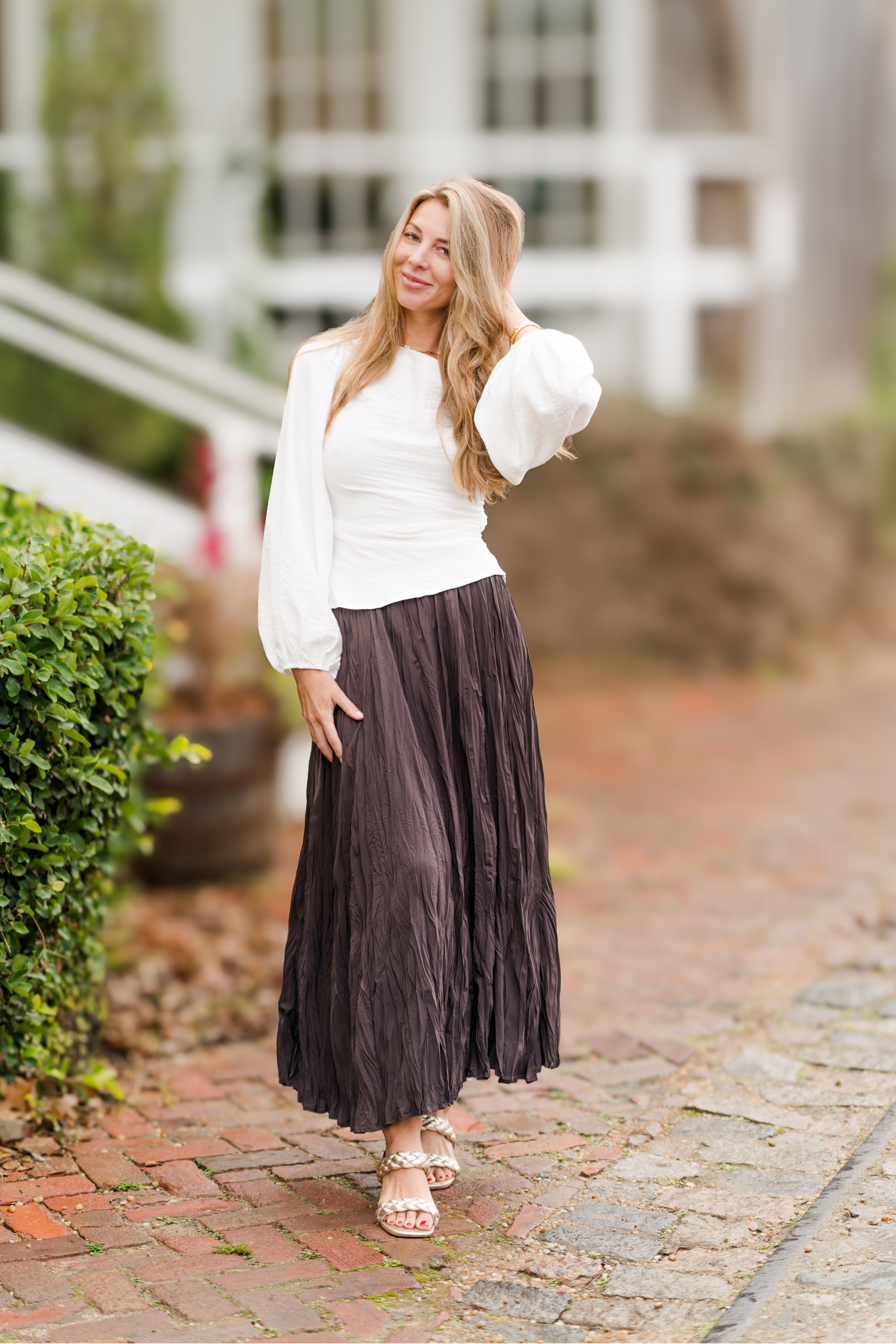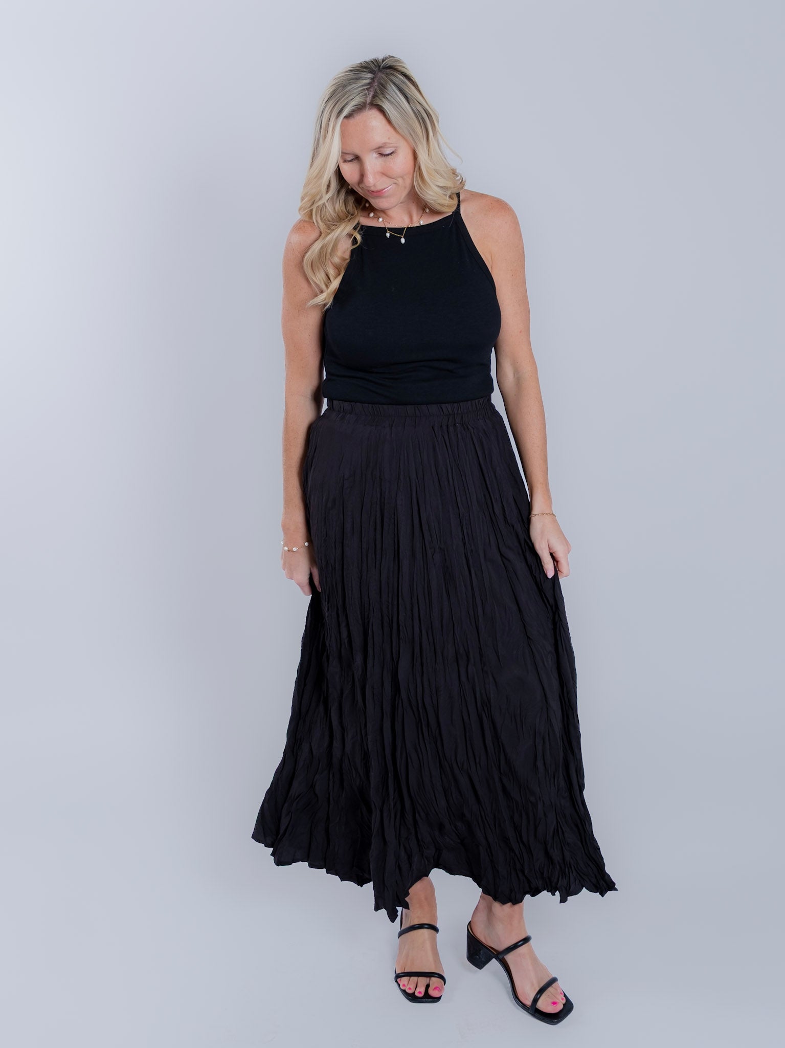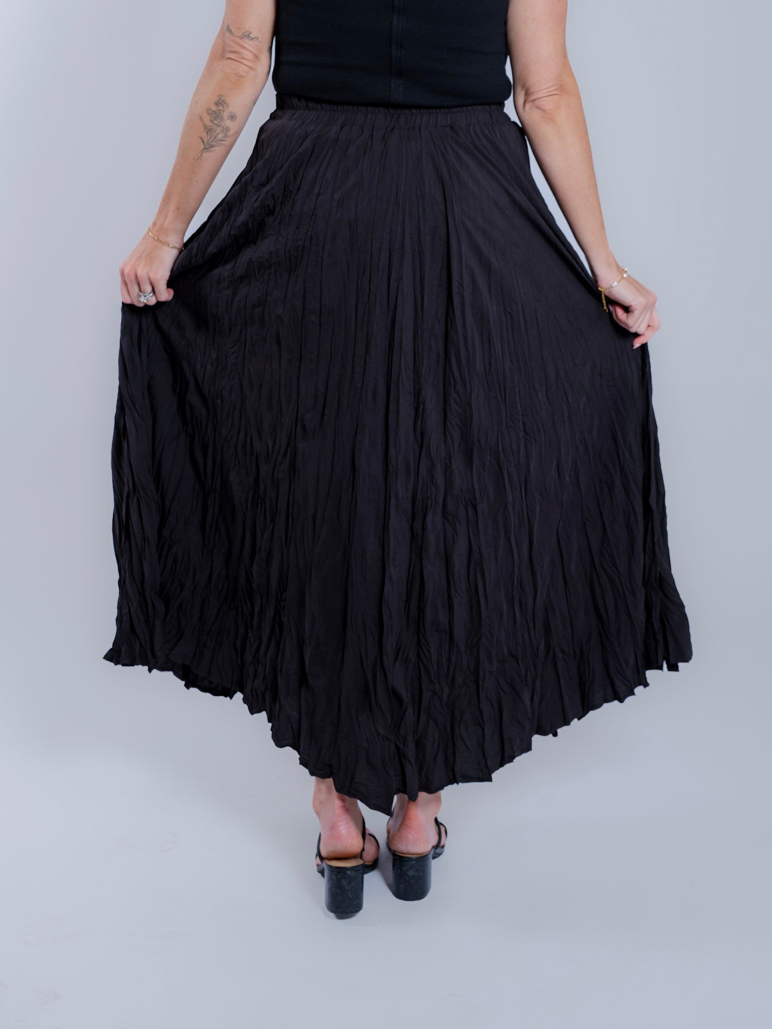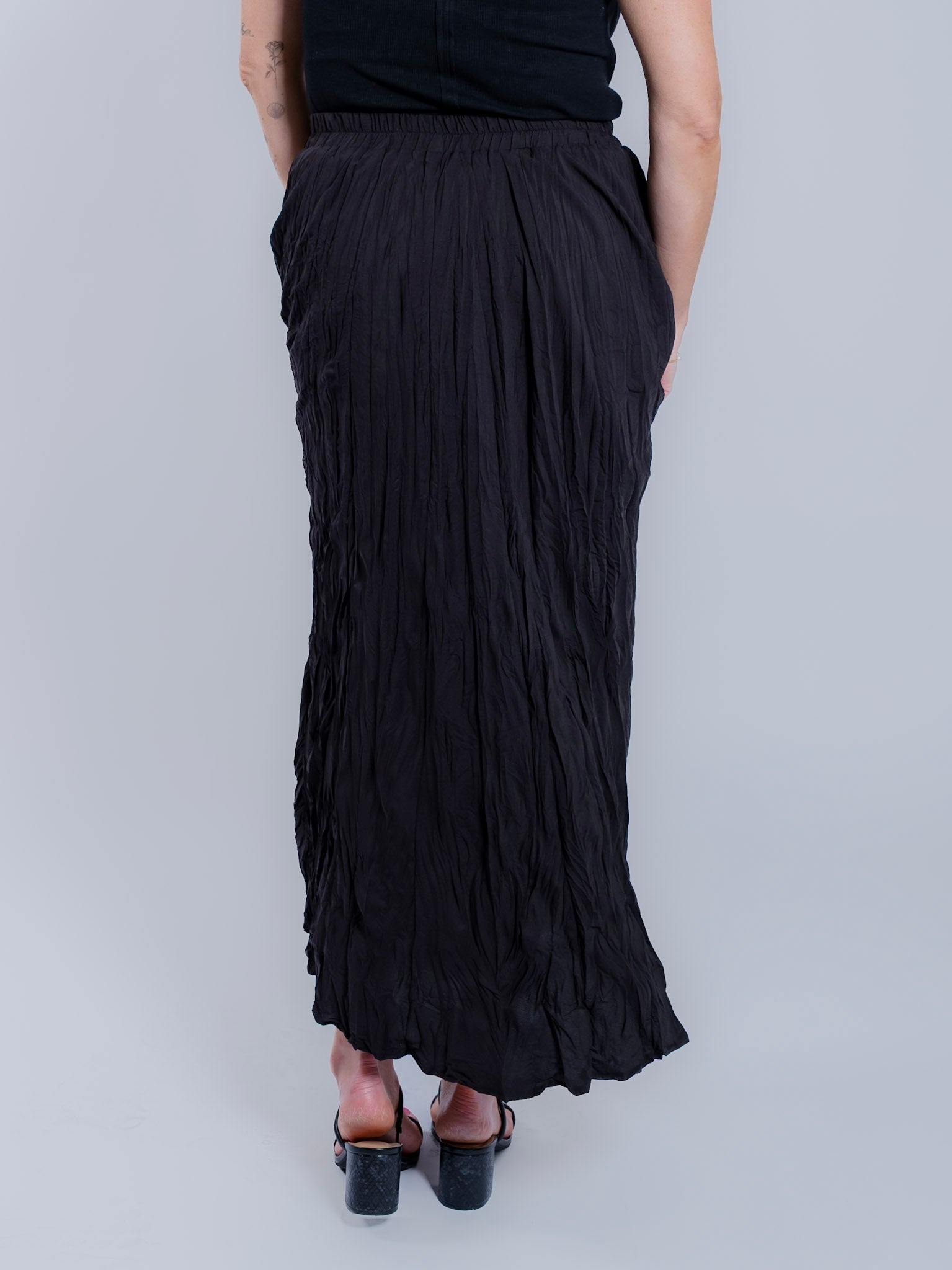 This textured maxi skirt brings effortless movement and understated elegance to your everyday wardrobe. Designed with a softly crinkled finish, a flowy silhouette, and a comfortable elastic waistband, it’s perfect for pairing with simple knits, fitted tees, or layered tops.