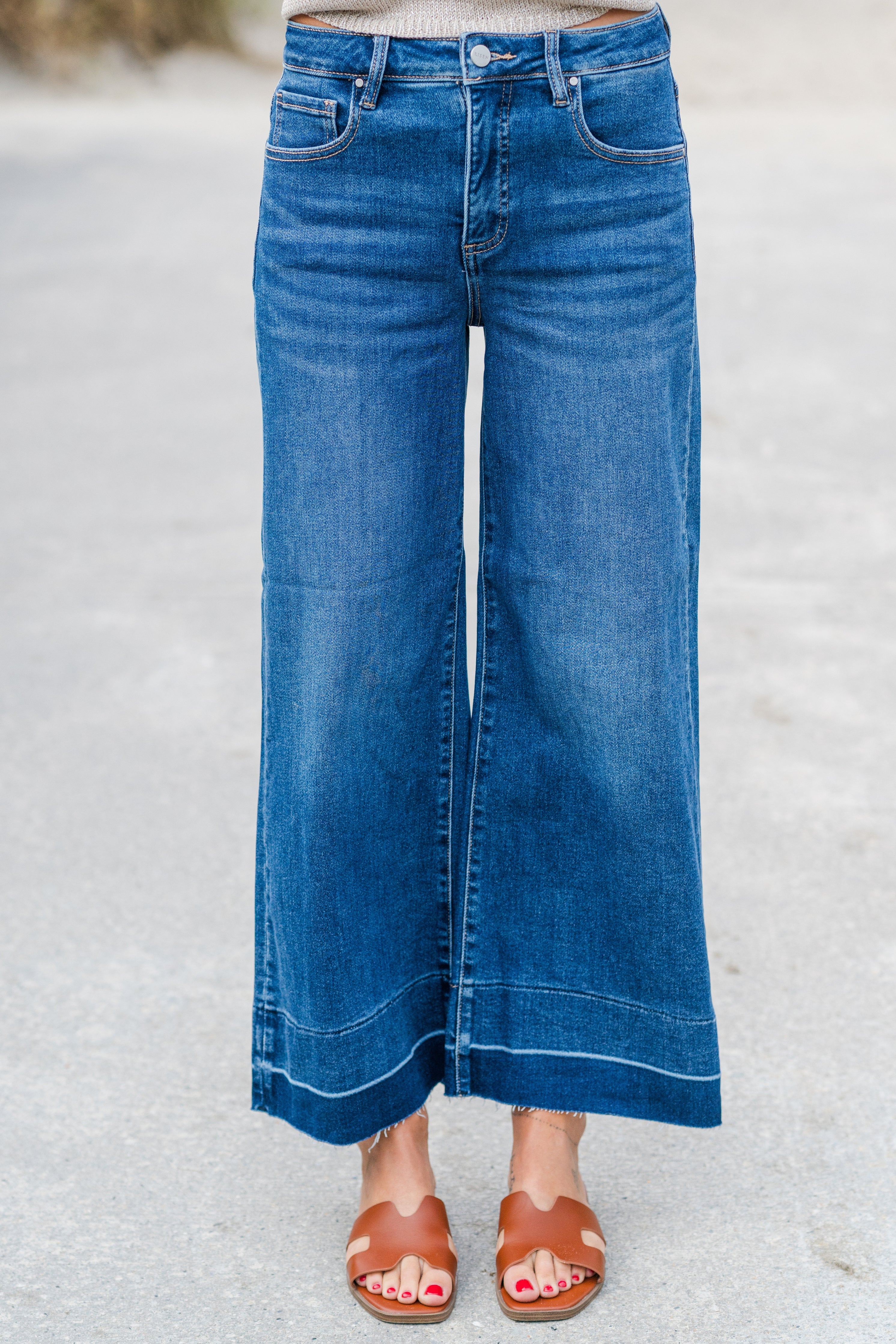 A modern take on a timeless staple, these wide crop denim jeans are effortlessly versatile. Designed with a flattering high rise and structured wide-leg silhouette, they fall to a cropped length with a subtle double-stitched hem detail for added style.