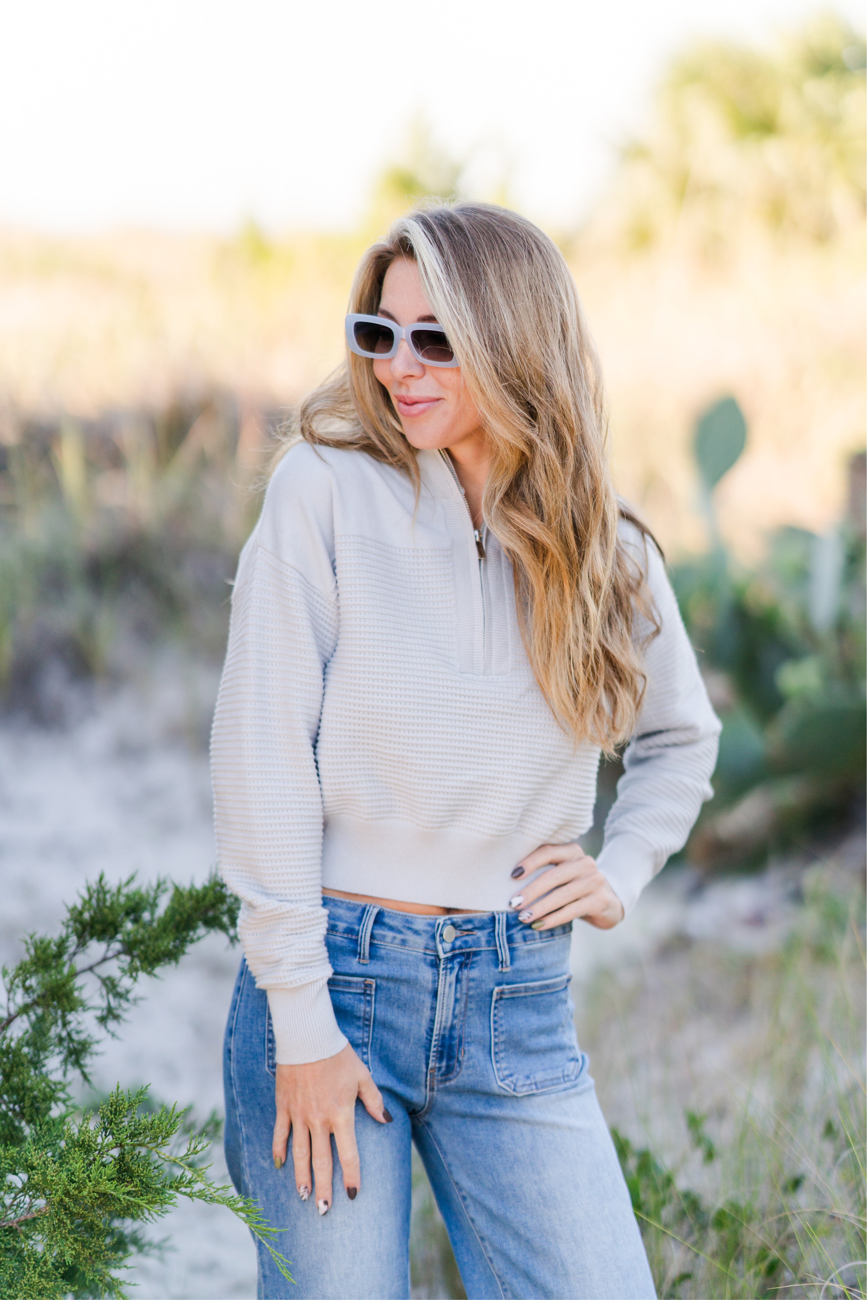 This waffle knit quarter zip pullover is a cozy essential with a modern touch. Featuring a textured knit body, stand collar, and zip neckline, it offers both style and versatility.